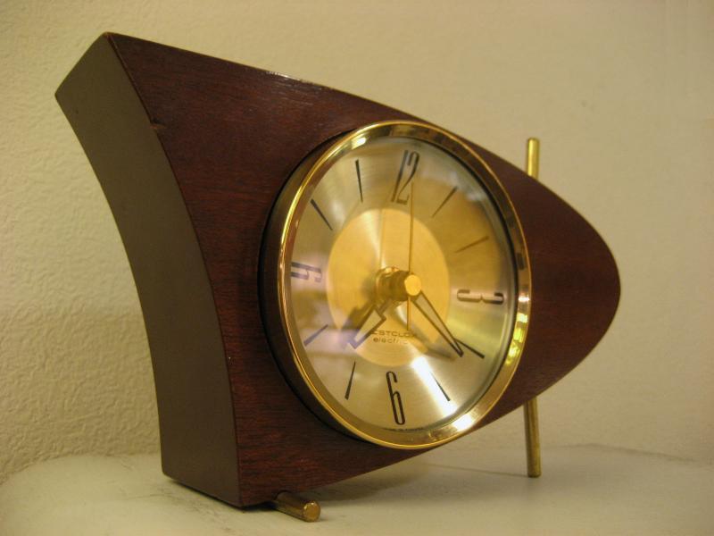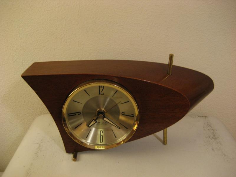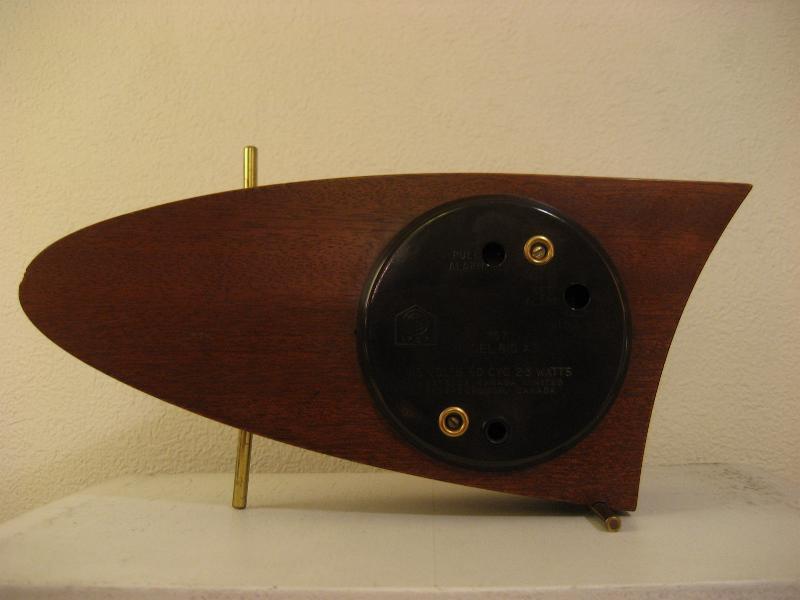 MADE IN CANADA ブーメランシェイプのアトミックな置時計。ミッドセンチュリーデザインの代表的な時計です。ウッドメイドのボディ&ケースにゴールドブラスロッドアクセント。クールでGOODなビンテージタイムピース! ムーブメントはバッテリータイプ(単3x1個使用)に交換済みですので時間は正確です。 |