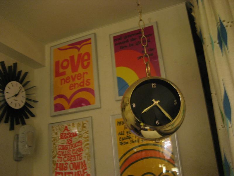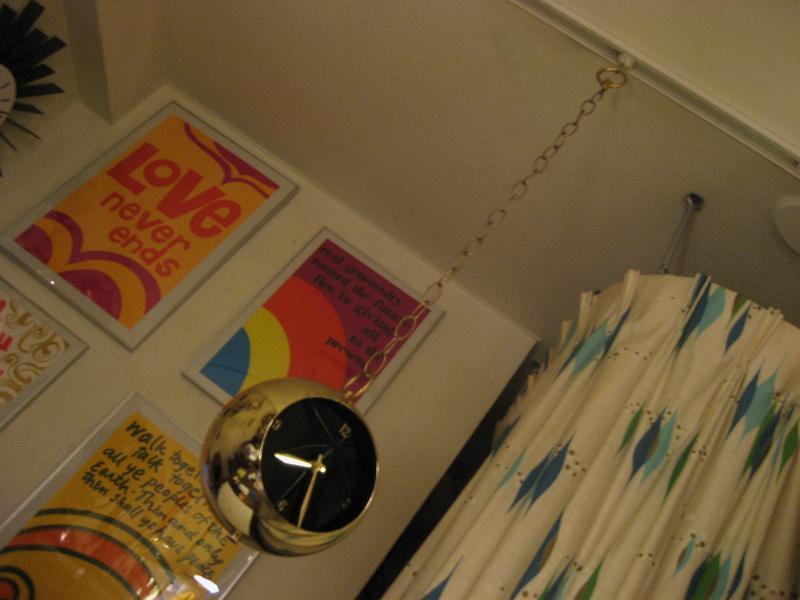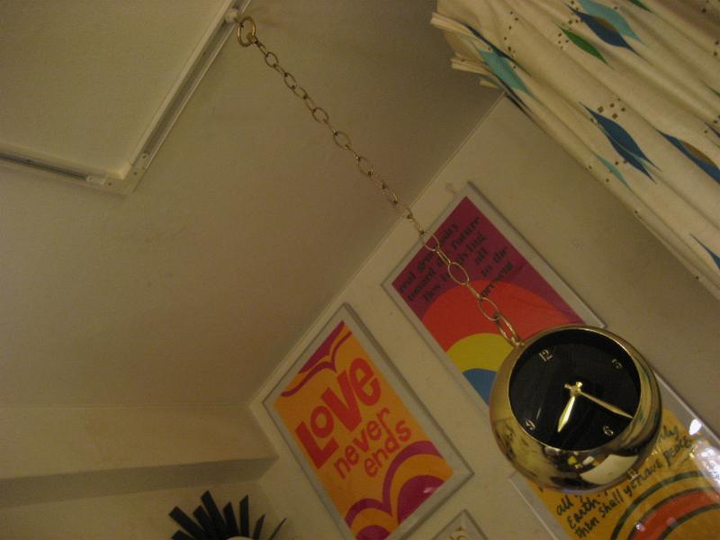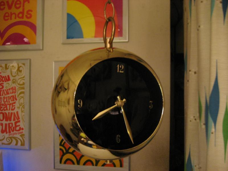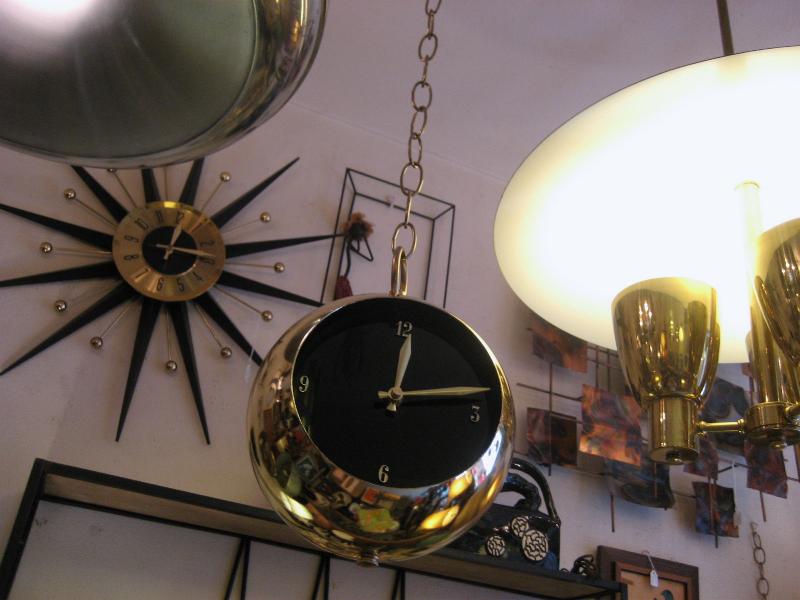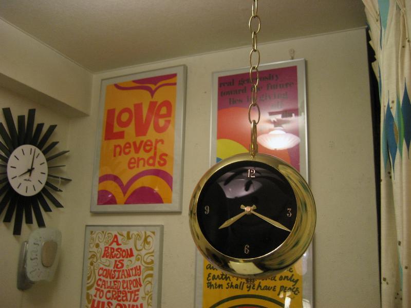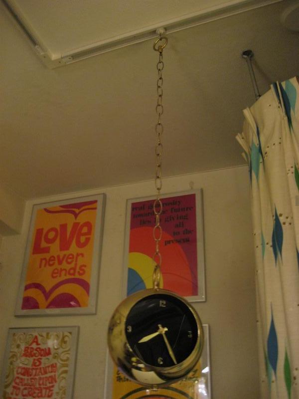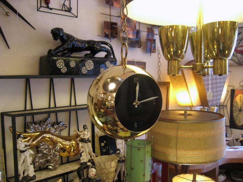 | ビンテージアトミックシーリングクロック / 50-60年代 USA. ペンダントランプのように天井から吊り下げるタイプのレアなハンギングクロック。ブラスメイドのボールシェイプボディの内側にアクリルメイドの文字盤でゴールドハンド&インデックス。ハワードミラークロックのようにクールでGOODなビンテージタイムピース! 写真のように文字盤を回転させて時刻調整や電池交換などメンテナンスも簡単にできます。 ムーブメントはバッテリータイプ(単3x1個使用)に交換済みですので時間も正確です。 |