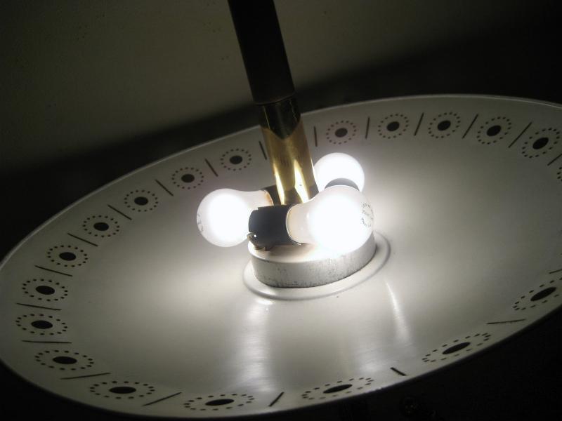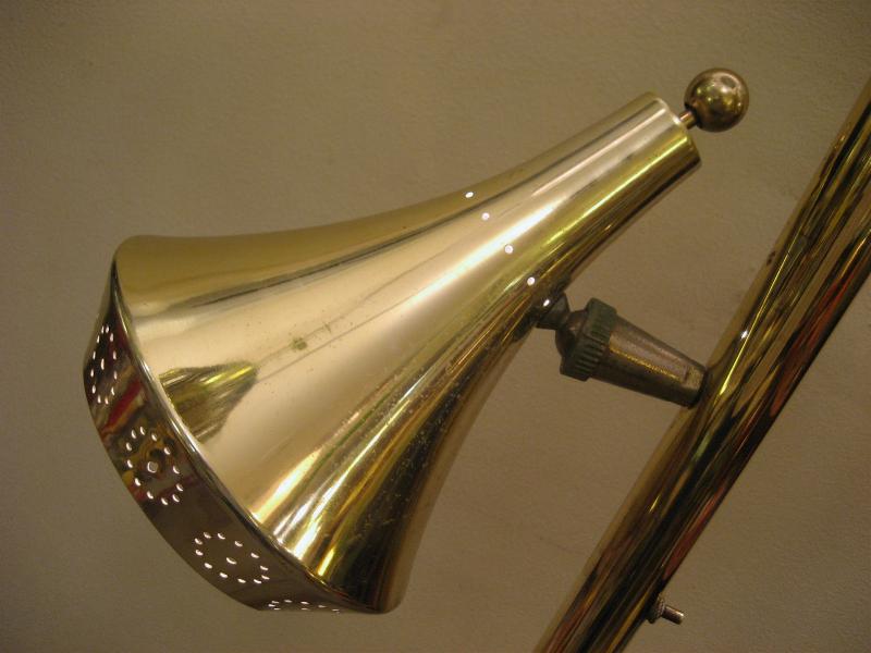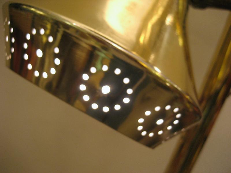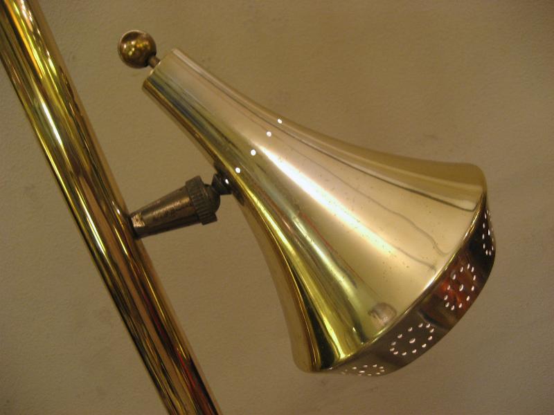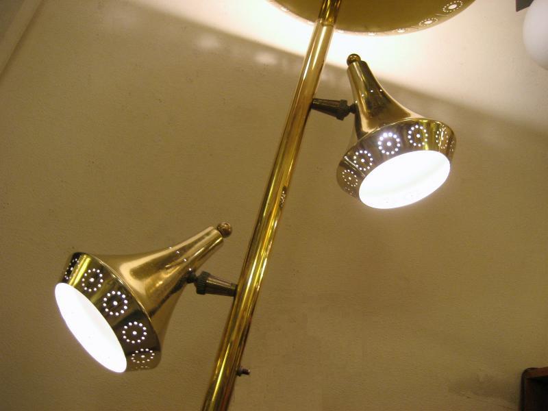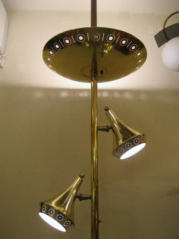| ビンテージアトミックフロアポールランプ / 50年代 USA. レアなアッパーシェード付きのダブルスポットフロアランプ。天井と床に突っ張らせるテンションロッドタイプ。各ランプシェードはゴールドブラスでポールはゴールドとダークブラウンのツートーン。シェードにはそれぞれ飾り穴付き。天井向きのアッパーランプは電球3個使用。 クールでGOODなビンテージライティングピース! 電源は家庭用コンセント対応コードで、スイッチはアッパーが3WAYタイプとスポット用はポールにそれぞれ別に付いています。 |