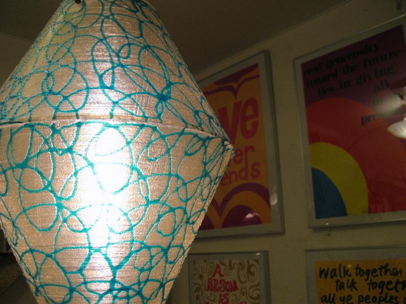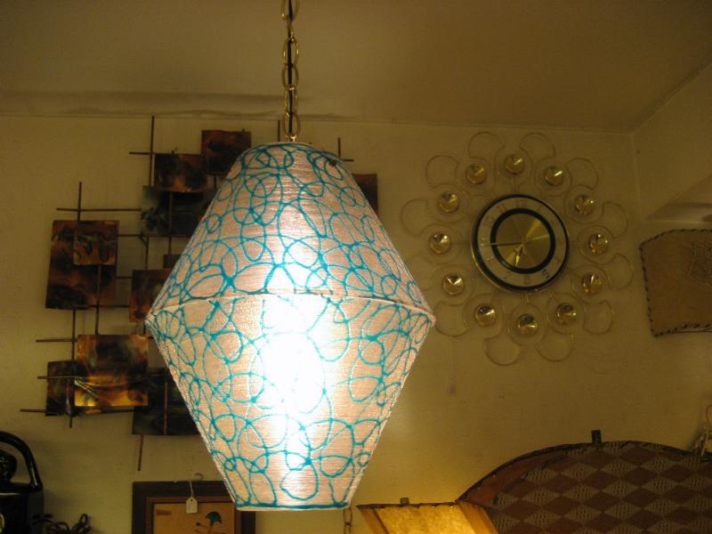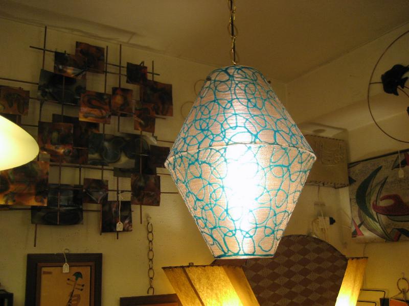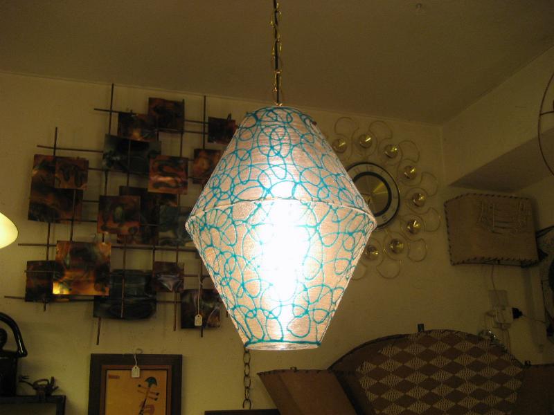 | ビンテージアトミックペンダントランプ / 50-60年代 USA. UFOシェイプのアトミックシーリングランプ。シェードはアクリルファイバーグラスメイドでグリーンスワールアクセントカラー。クールでGOODなビンテージライティングピース! 電源は家庭用引掛けシーリングタイプに交換してありますのですぐに設置可能です。 |