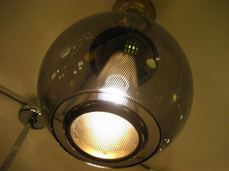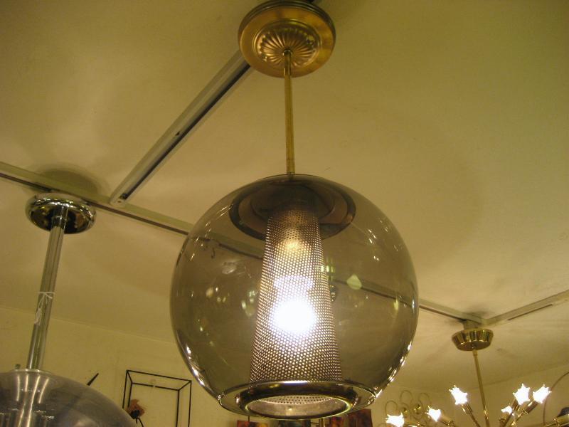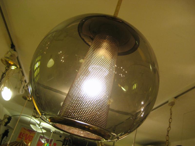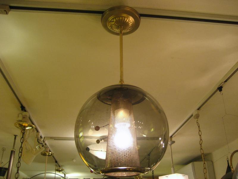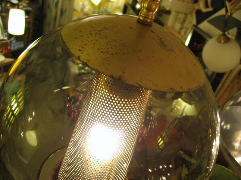 | ビンテージアトミックシーリングランプ / 60年代 USA ゴールドブラスメイドのメッシュスポットにスモークガラスメイドのボールシェイプアウターシェードのアトミックランプ。内玄関や廊下、お部屋のアクセント照明としてもクールでGOODなビンテージライティングピース! 電源は引っ掛けシーリングに交換済みですのですぐに設置可能です。 |