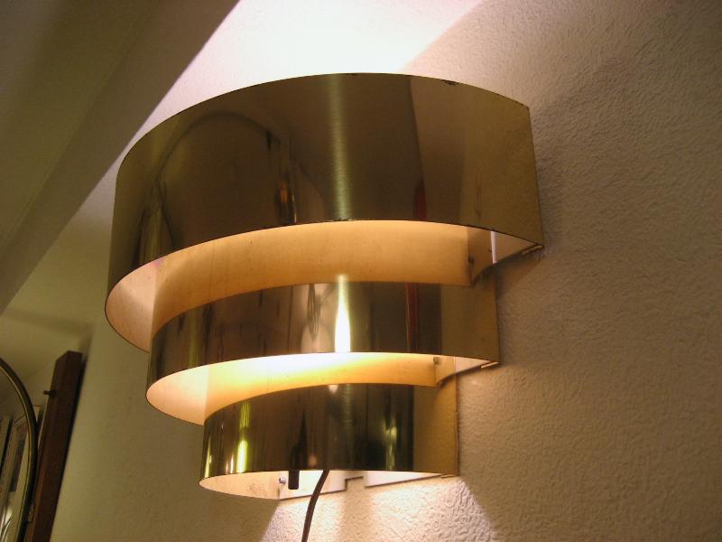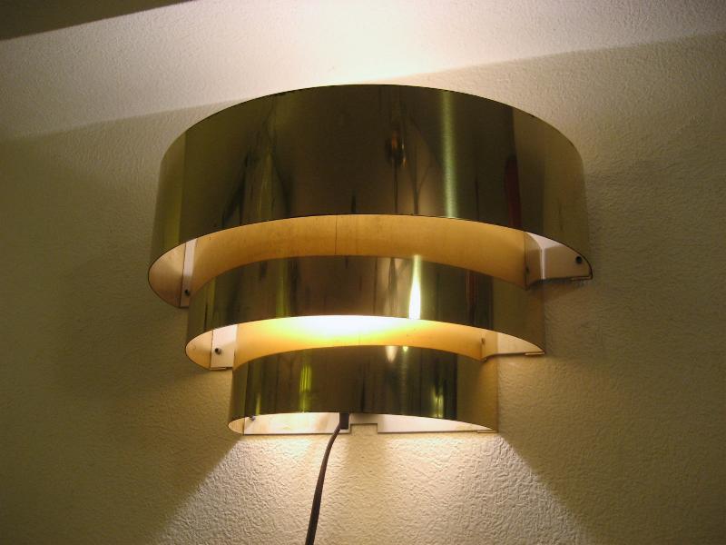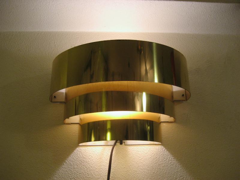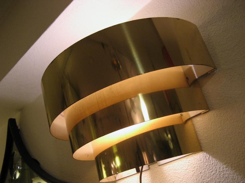 | ビンテージアトミックウォールランプ / 60年代 USA. 半円ラウンドバンドのブラスメイド3段スリットシェード壁掛けランプ。上下に独特な明かりを放つクールでGOODなビンテージライティングピース! 電源は家庭用コンセント対応で、スイッチはバルブソケット下に付いていてロータリータイプ。 |