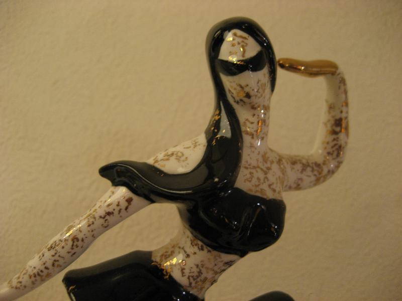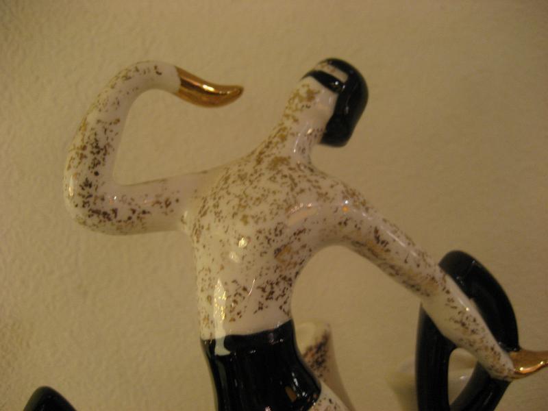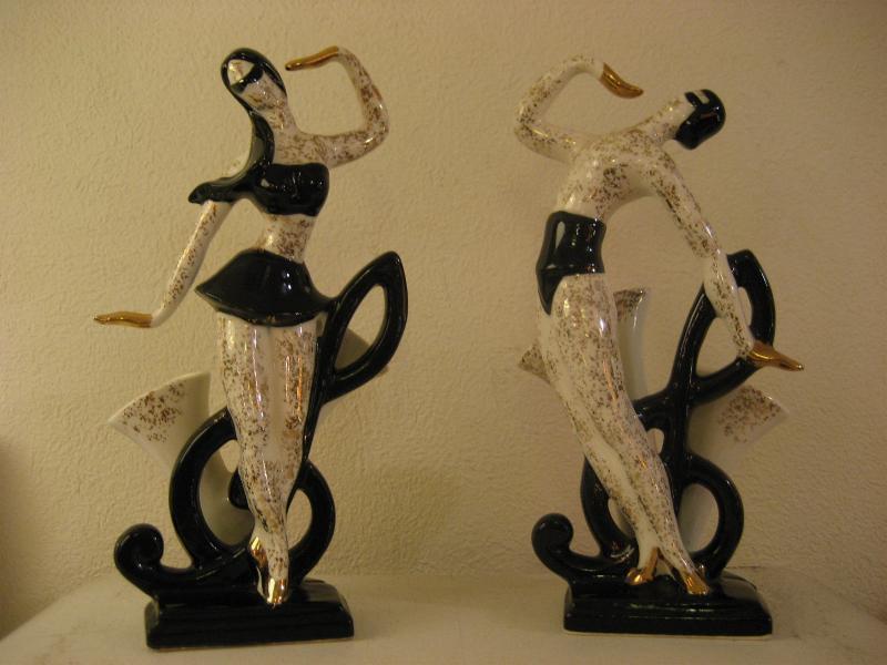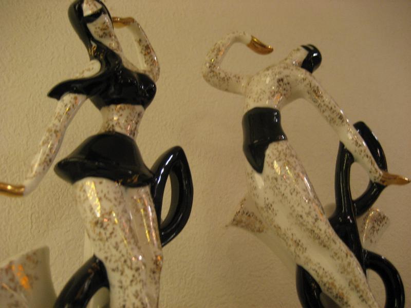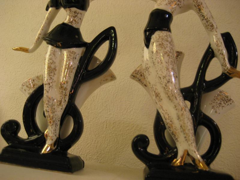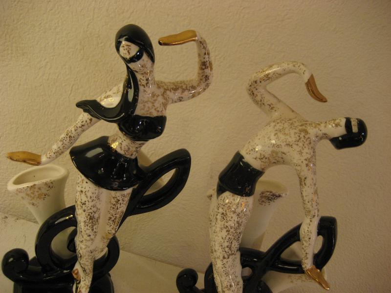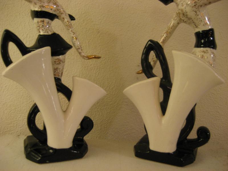 | ビンテージペアハーレクインデコ / 50年代 USA. ARTMARK社 陶器製の男女ペアハーレクイン置物。足元にトーン記号デコ、バックには珍しいツインタイプフラワーベースプランターがデコレーションされています。カラーはブラック・ホワイト・ゴールドアクセントと50sならではのクールでGOODなビンテージデコレーションピース! |