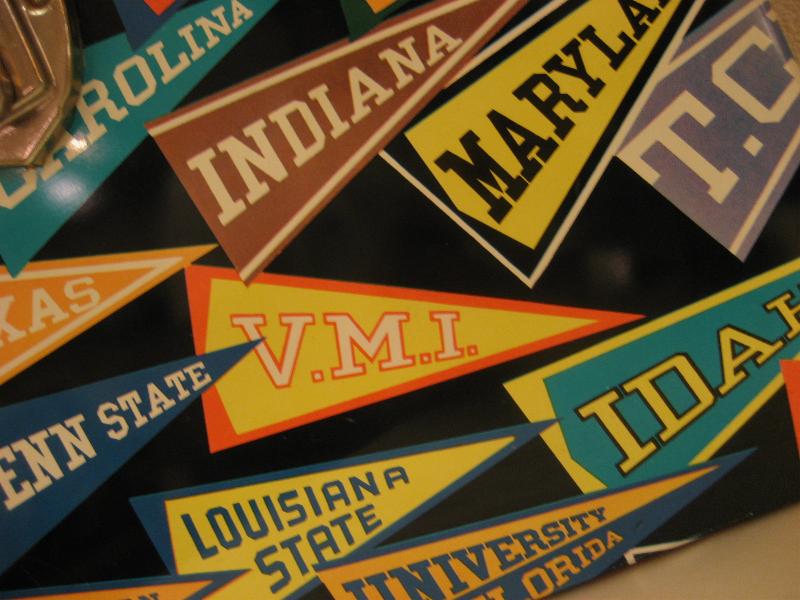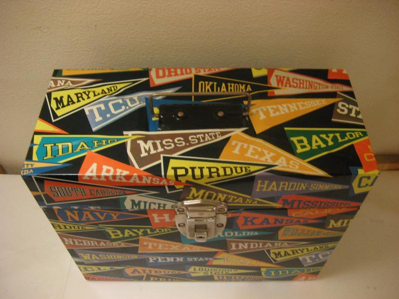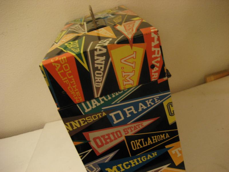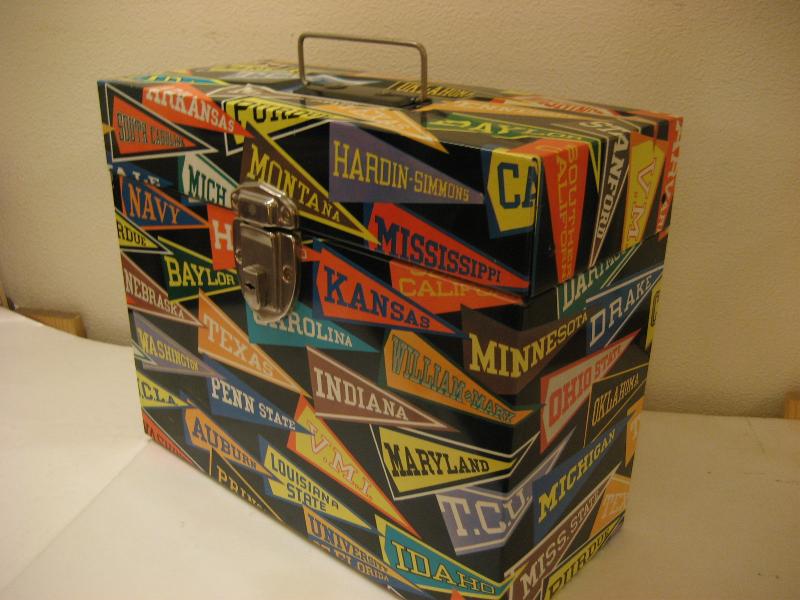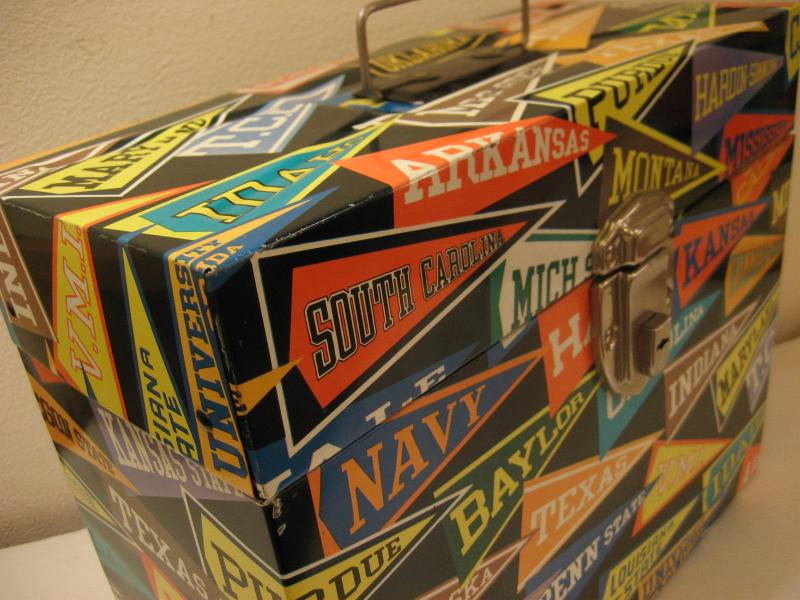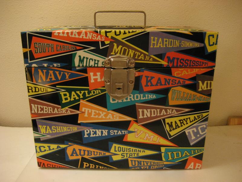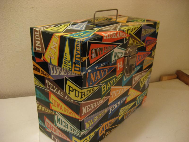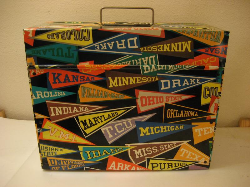 | ビンテージポータブルボックス / 50-60年代 EXCELSIOR STANFORD, CONN. USA. 総柄カレッジバナープリントがクールなハンドル付きメタルメイドボックス。コネチカット州の"EXCELSIOR STANFORD UNIVERSITY"で使用されていたもの(おそらく大学の生協で販売していた?)と思われます。内側は仕切りなしのフリーボックスですから使い方もフリー! バッグとして使ってもGOODなビンテージピース! |