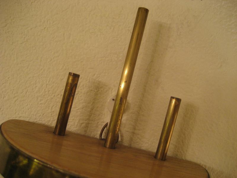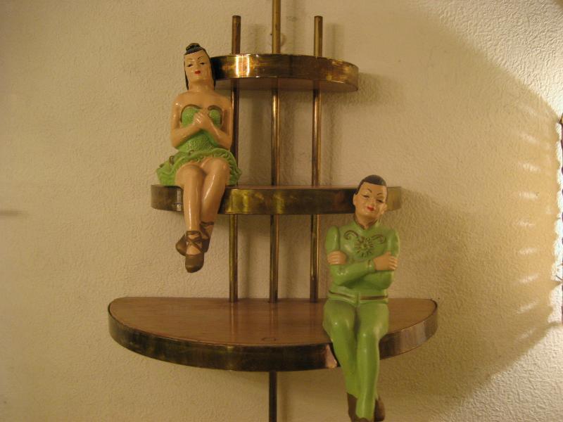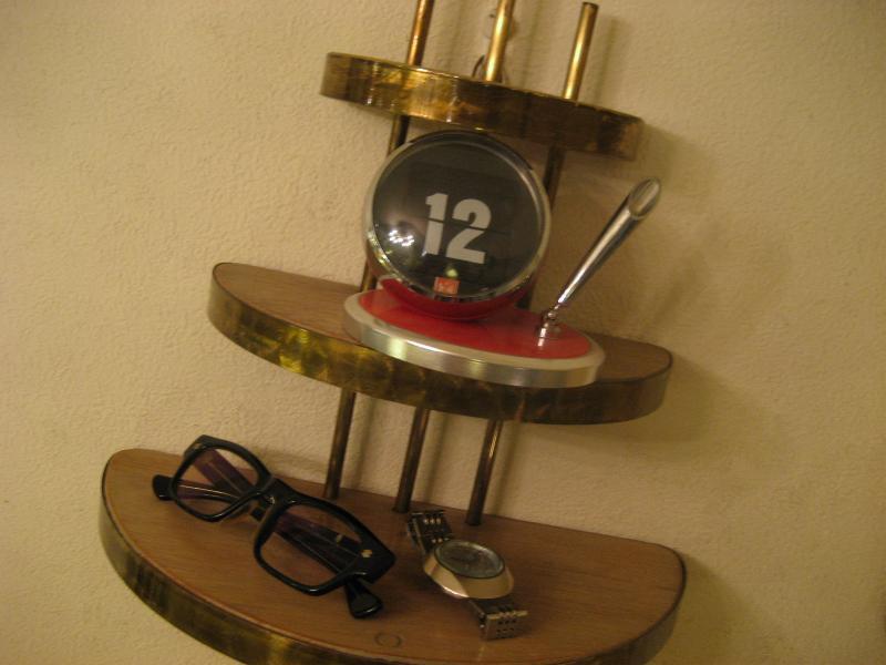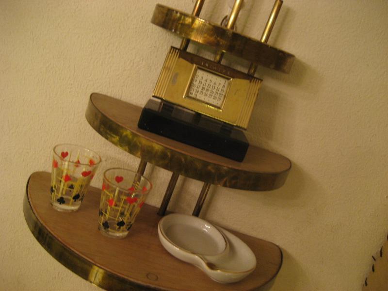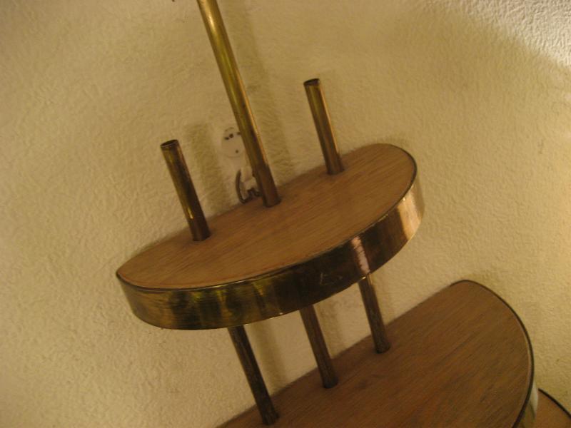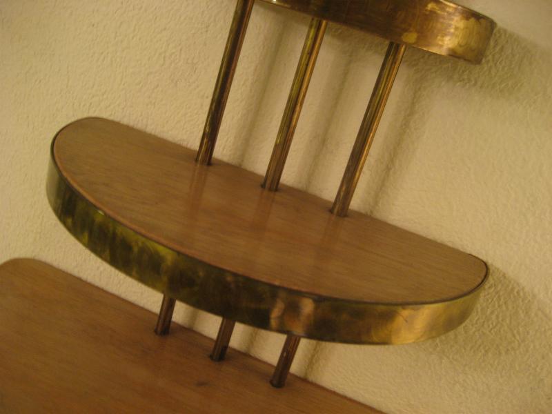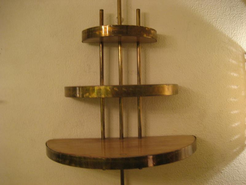 | ビンテージアトミックウォールシェルフ / 50-60年代 USA. ウッドメイドのハーフラウンド3段シェルフ(壁掛け飾り棚)。ゴールドブラスパイプフレームにエッジモールデコ。壁スペースにクールでGOODなビンテージウォールピース! |