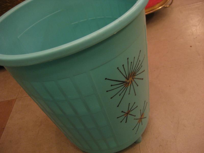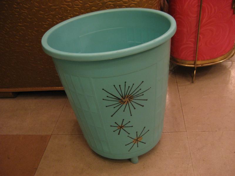 | ビンテージアトミックトラッシュボックス / 50-60年代 USA スターバーストプリントのビンテージゴミ箱です。プラスチックメイドで底面は4本足付き。ドレッサーサイドなどにGOODなクールバニティピース! |