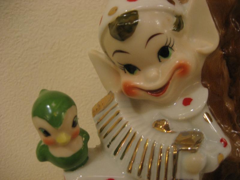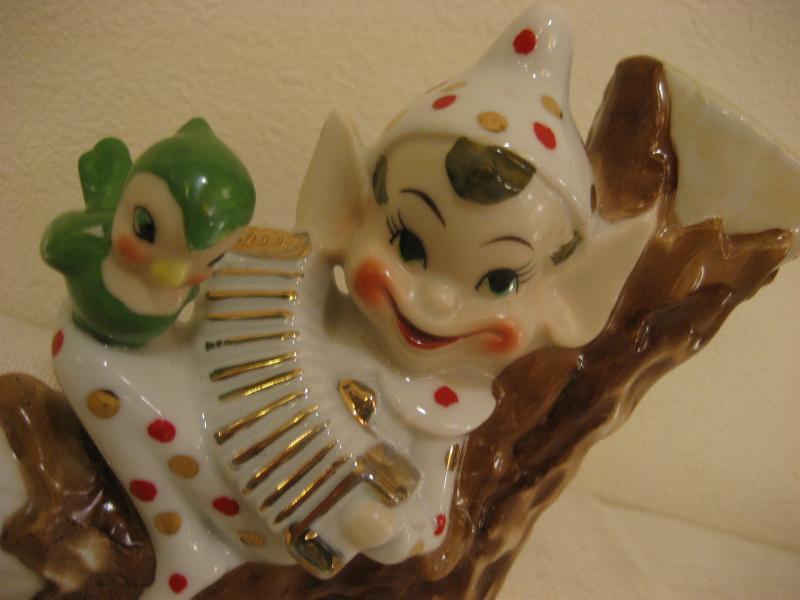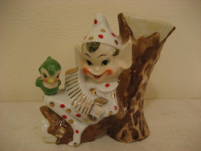 | ビンテージ置物 / 50年代 USA. 陶器製の妖精フラワーベースタイプ置物です。コスチュームはかわいいドット柄。切り株の根もとで楽器を演奏しているポーズでヒザに小鳥がとまっているところがとってもキュート。シェルフやウィンドウフレームなどのディスプレイにキュートでGOODなビンテージディスプレイピース! |