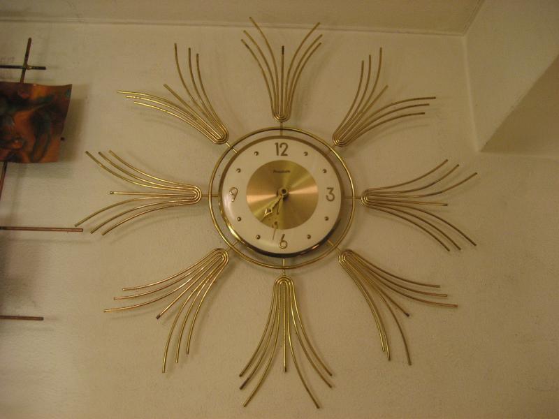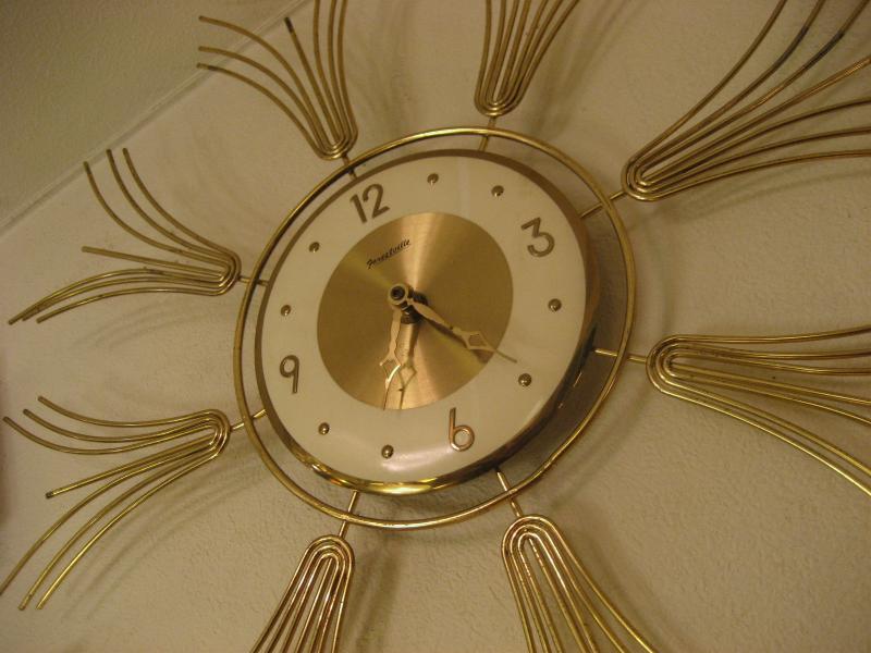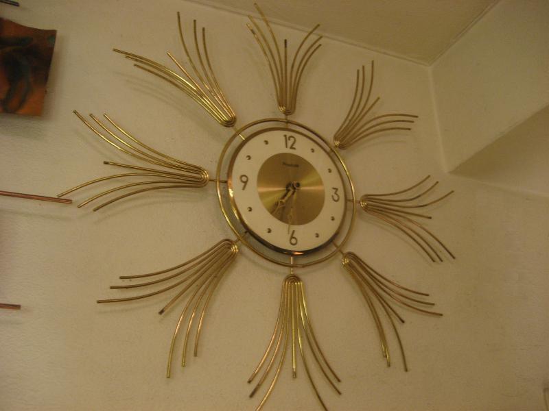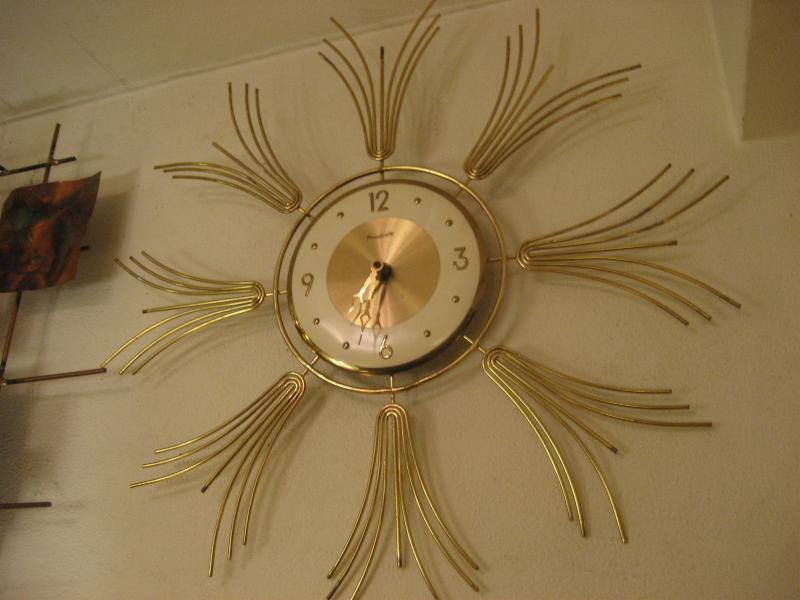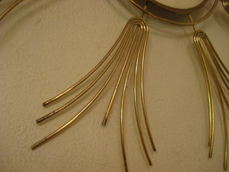 | スターバースト/サンバーストウォールクロック / Forestville社製, 50-60年代 USA. ゴールドブラスアトミックスポークフレームがクールなスターバースト壁掛け時計。ゴールドインデックス&ゴールドハンド。 ムーブメントは旧バッテリータイプ(単2x1個使用)ですので時間も正確です。 |
