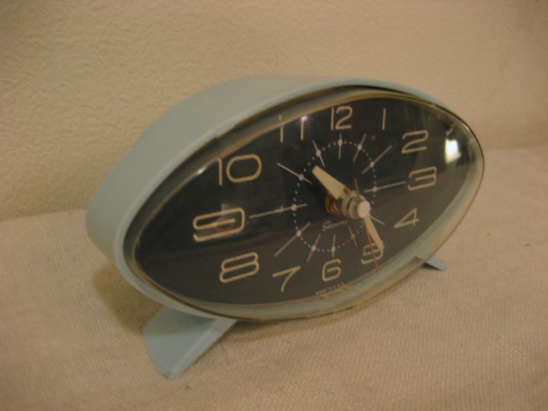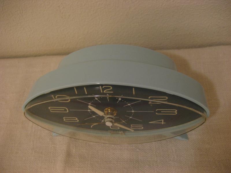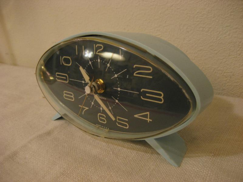 IN USA. 50年代独特のEYEシェイプのクールな置時計です。ボディカラーはミントブルーで文字盤はクロに近いダークグレー。クールでアトミックなタイムピース! ムーブメントはバッテリータイプ(単3x1個使用)に交換済みでですので時間は正確です。 |