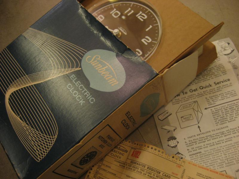 | ビンテージウォールクロック / 50-60年代 サンビーム社製 MADE IN USA. デッドストック(未使用) オリジナルBOX入りデッドストックの壁掛け時計。取説・ギャランティカードも入っているコンプリートストック。お部屋はもちろんキッチンなどにも! ボディカラーはアイボリーベージュ、文字盤はウッド調ブラウン。クールでGOODなビンテージタイムピース! ムーブメントはバッテリータイプ(単3x1個使用)に交換済みですので時間は正確です。 |