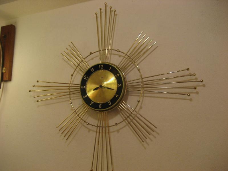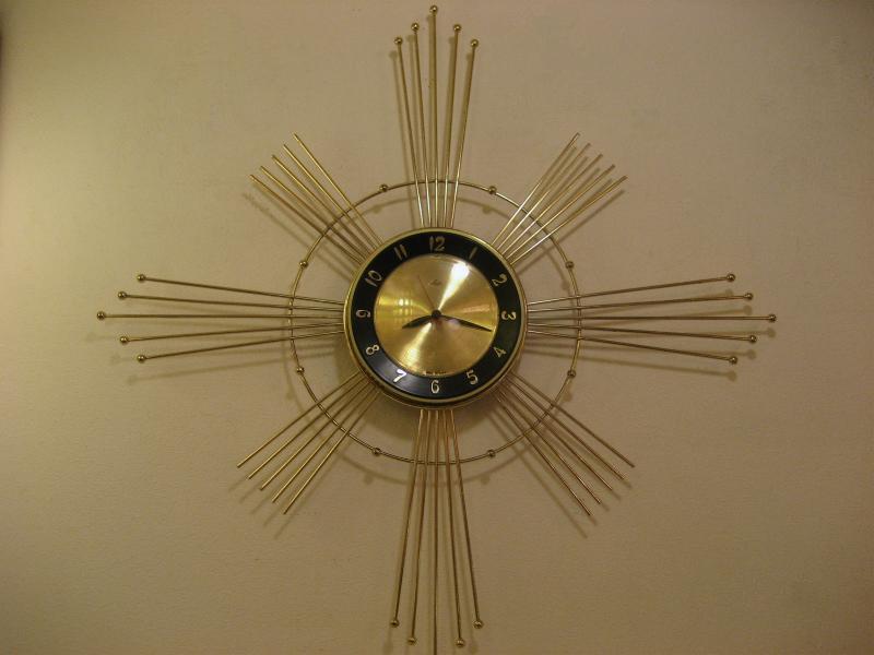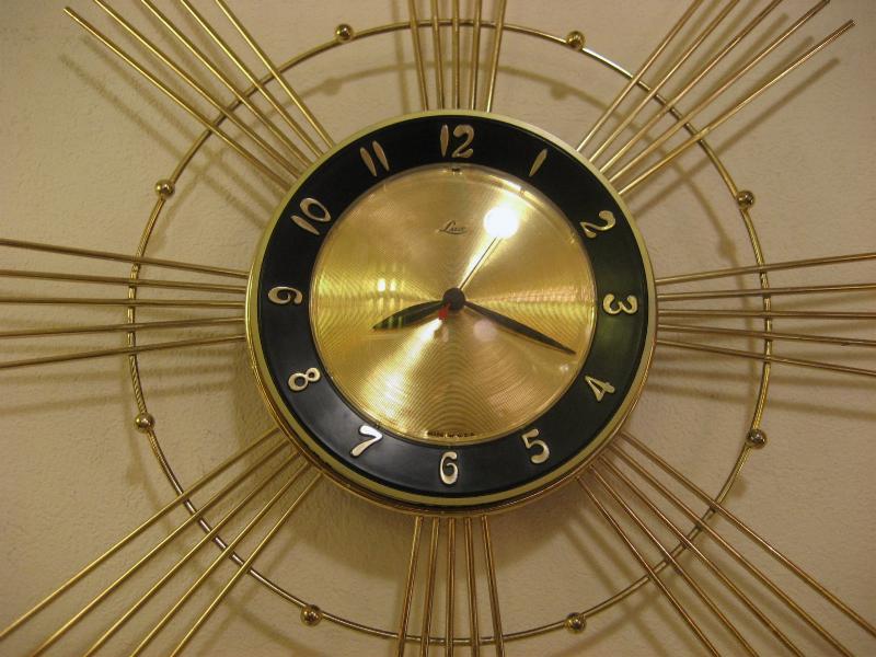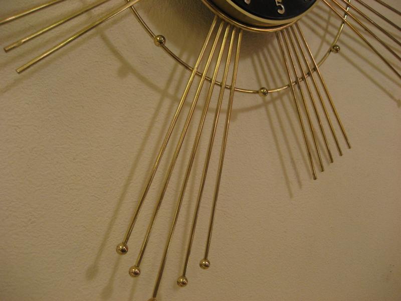 | ビンテージスターバーストウォールクロック / 50-60年代 LUX社, MADE IN USA. ゴールドブラスのスターバースト(サンバースト)スポークのビンテージ壁掛け時計。文字盤は黒金カラーでブラックハンド&レッドカラーの秒針がアクセント。クールでGOODなビンテージタイムピース! ムーブメントはバッテリータイプ(単3x1個使用)に交換済みですので時間は正確です。 |