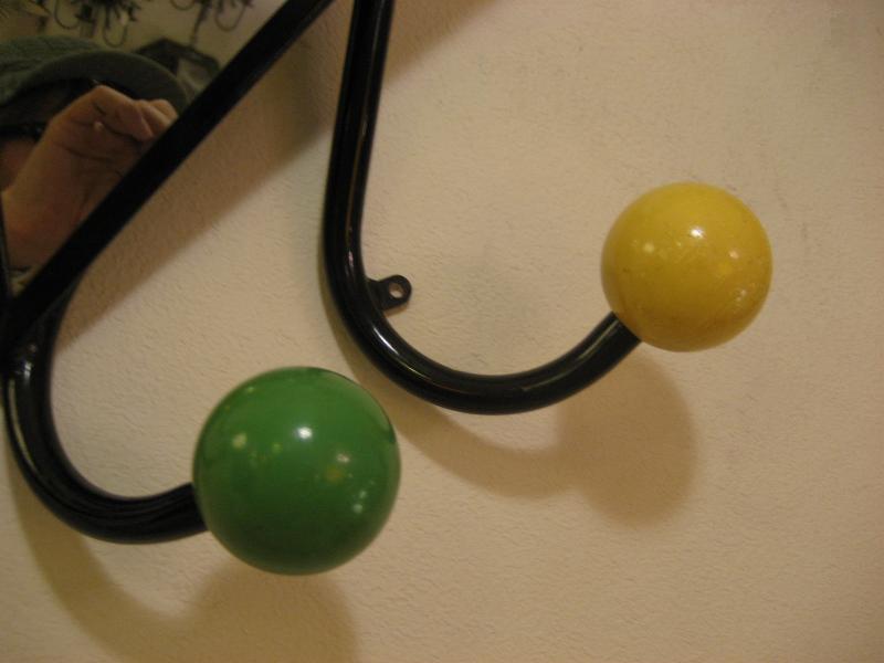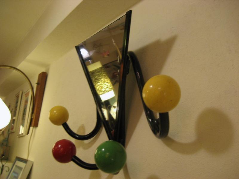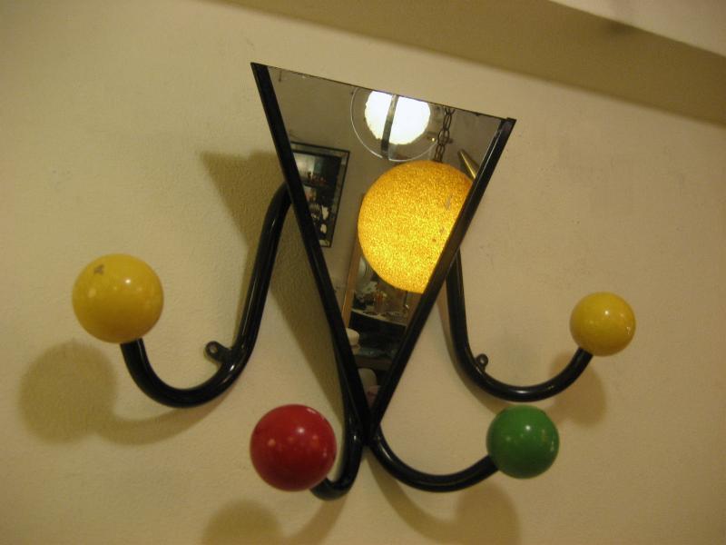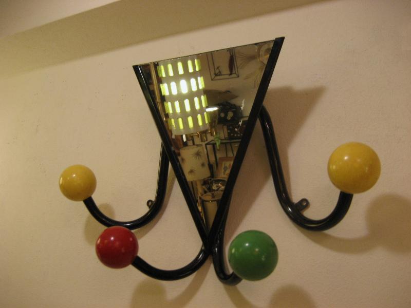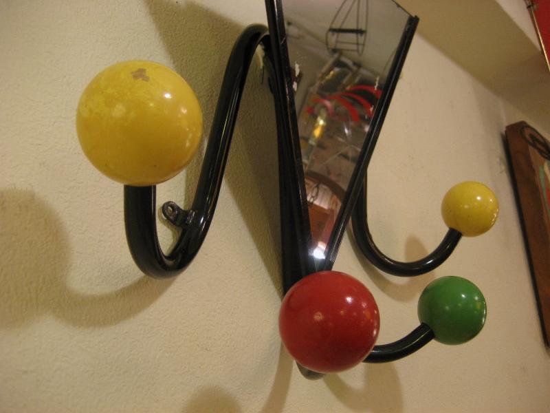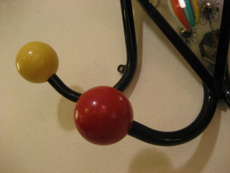 | ビンテージミラーウォールハンガー / 50年代 USA. 4本アームにウッドカラーボールのアトミックシェイプハンガー。ブラックアイアンフレームにミラー付きなので、ゲスト用としてもベストなアイテム。クールでGOODなビンテージウォールピース! |