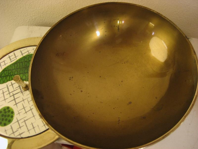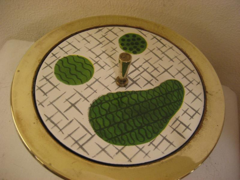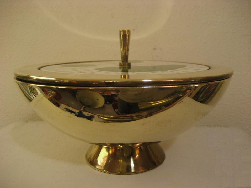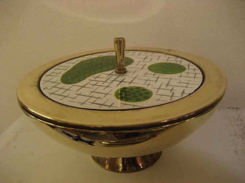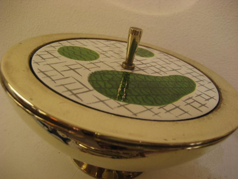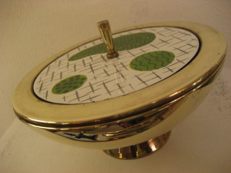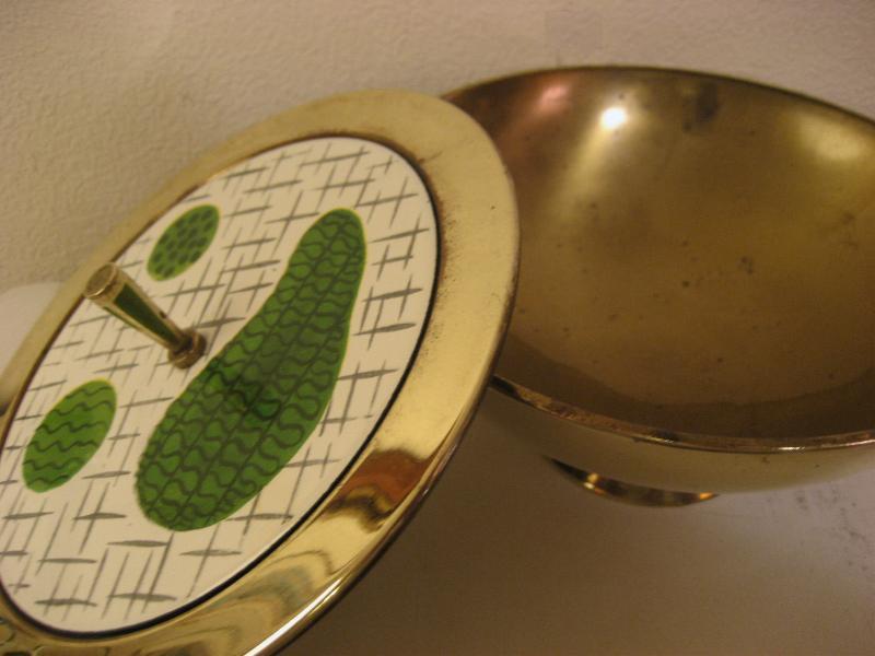 | ビンテージアトミックカバーボウル / 50-60年代 USA. ブラスメイドのアトミックシェイプボウル。アトミックなブーメランとカスリ調絵柄のエナメルデコレーションプレートカバー付き。アクセサリーや小物入れなどにクールでGOODなビンテージピース! |