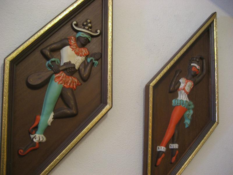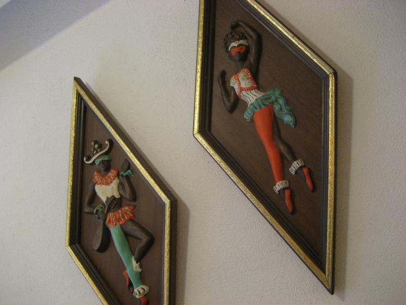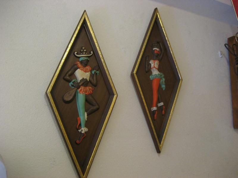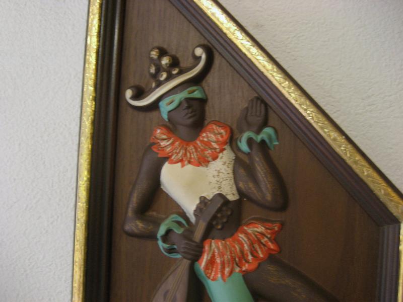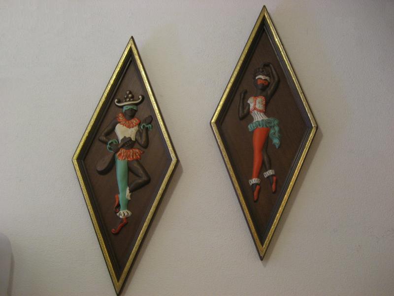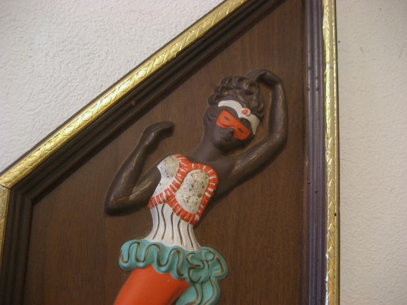 | ビンテージペアハーレクイン壁掛け 50-60年代 USA. ダイヤシェイプフレームのペアハーレクインウォールデコ。男性が演奏、女性が踊っている3Dタイプ。クールでGOODなビンテージウォールデコレーションピース! |