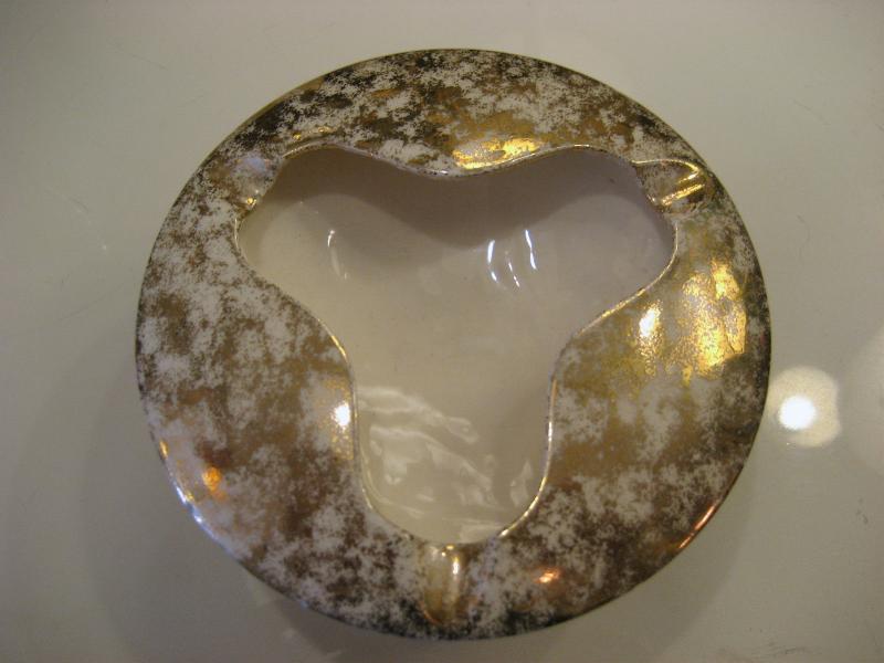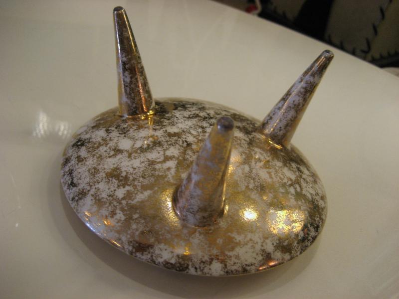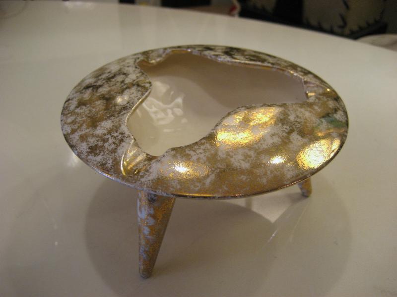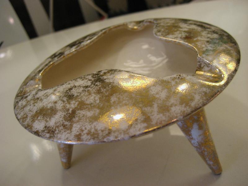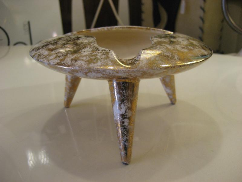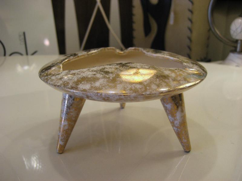 | ビンテージアトミックUFOアッシュトレイ / 50年代 USA. スペースシップシェイプの陶器製アトミック灰皿。レアな3本レッグタイプでゴールドフレークフィニッシュ。クールでGOODなビンテージテーブル&ディスプレイピース! |