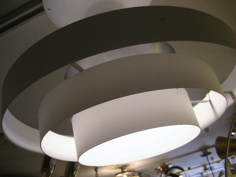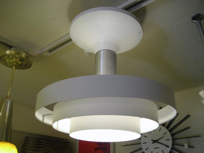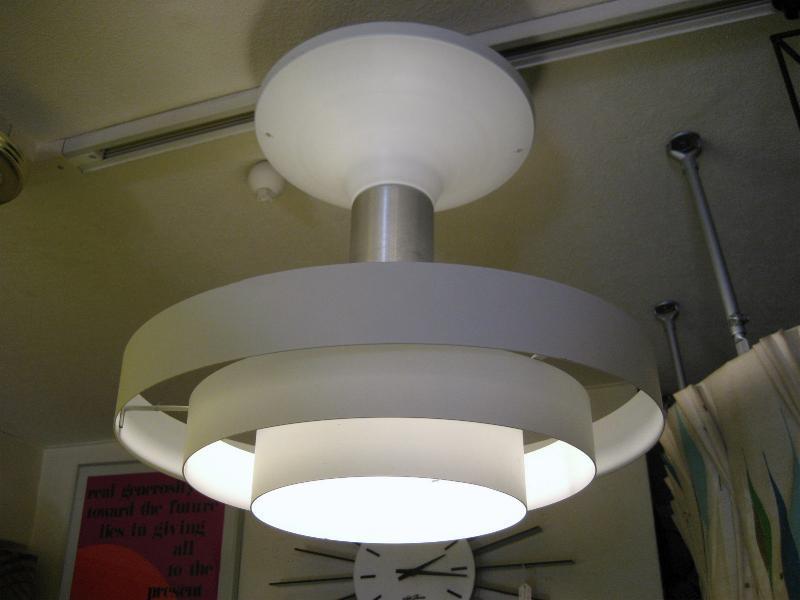 | ビンテージアトミックシーリングランプ / 50年代 USA. 古いダイナーやレストランなどで使用されることが多かった3段ラウンドリングのフィンシェードタイプのシーリングランプ。インダストリアルな雰囲気も持つマシンエイジな照明。 クールでGOODなビンテージライティングピース! 電源は家庭用引っ掛けシーリングに交換済ですのでかんたん設置、すぐに使用できます。 ※電球ソケット位置が奥なのでエクステンションソケット(延長ソケット)を付けてあります |