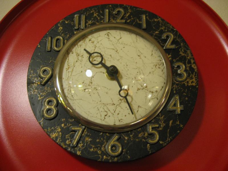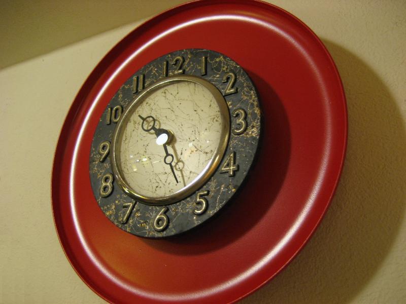 | ビンテージウォールクロック / 50-60年代 USA. レッドカラーフレームがクールなビンテージ壁掛け時計。メタルラウンドバックフレームにブラックダイヤルフレーム&オフホワイトインサイドバック。それぞれゴールドドレーピングアクセントでゴールドインデックスとブラックハンド。リビングはもちろん、キッチンなどにもGOODなビンテージウォールタイムピース! ムーブメントはバッテリータイプ(単3x1個使用)ですので時間は正確です。 |