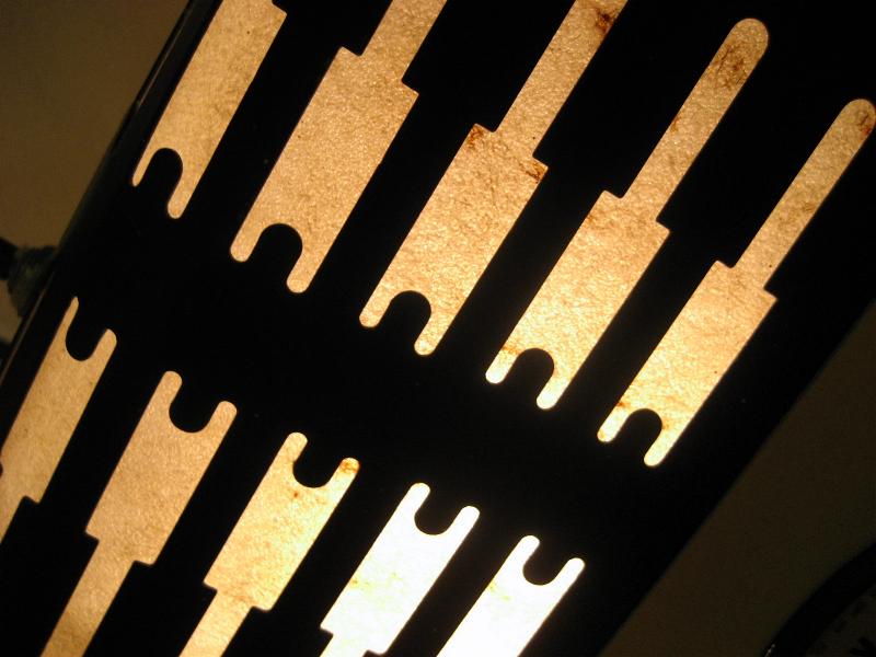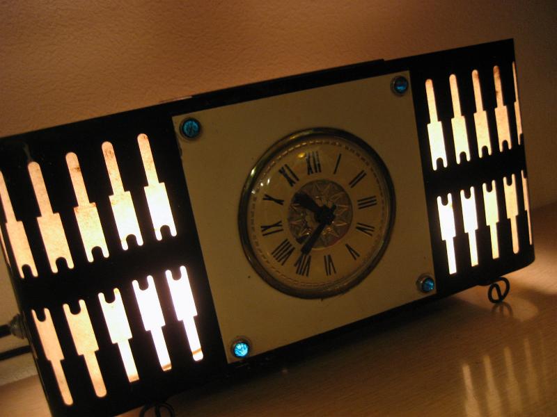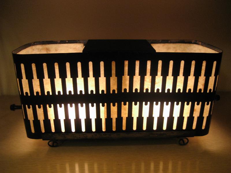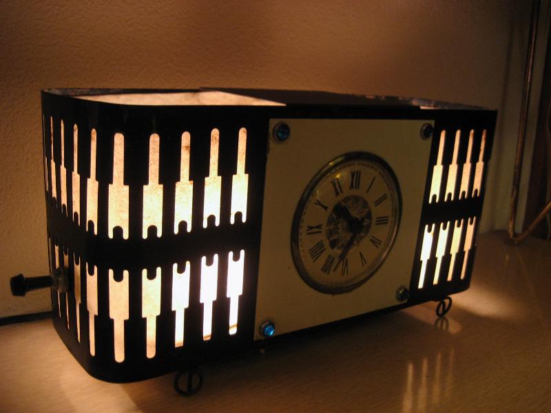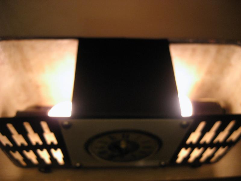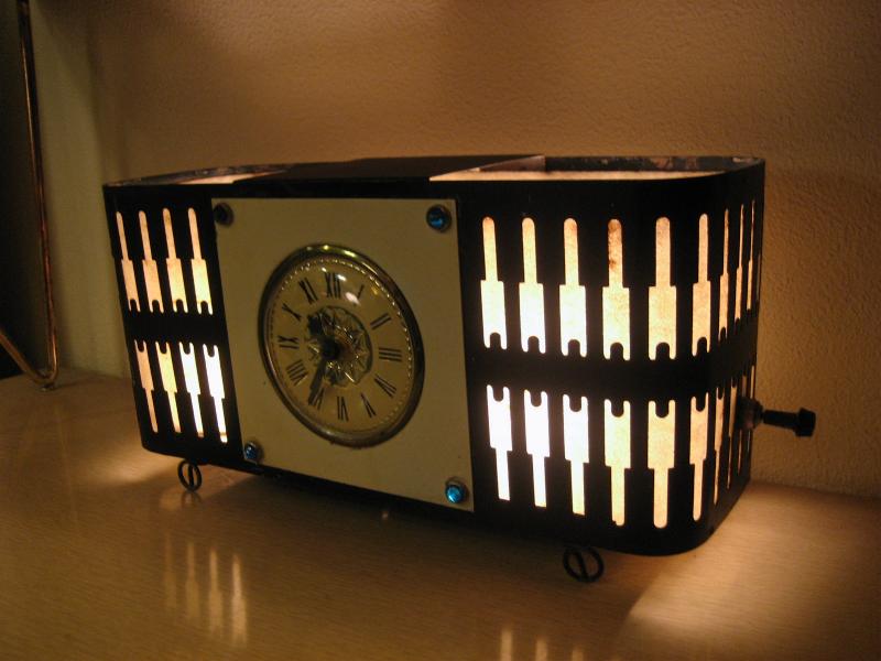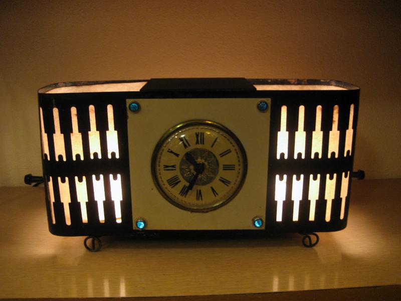USA. 両サイドがライトアップするタイプの置時計です。メタルフレームでメッシュ部分にファイバーグラスシェードがはめ込んであります。ランプ用の電源は家庭用コンセント対応コードで、スイッチは左右別々のライトアップ可能。時計のムーブメントはバッテリー式(単3x1コ使用)に交換済ですので時間は正確です。 |