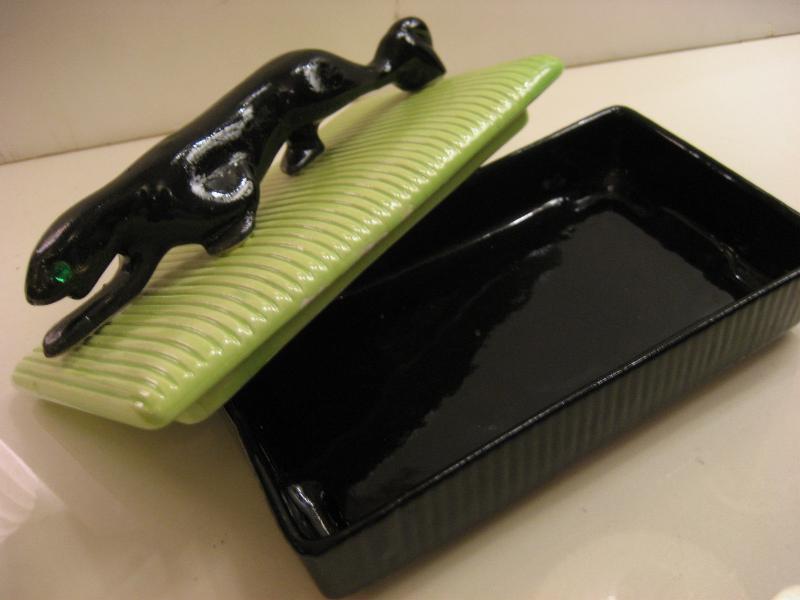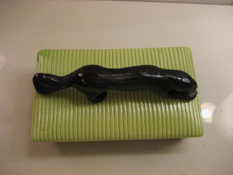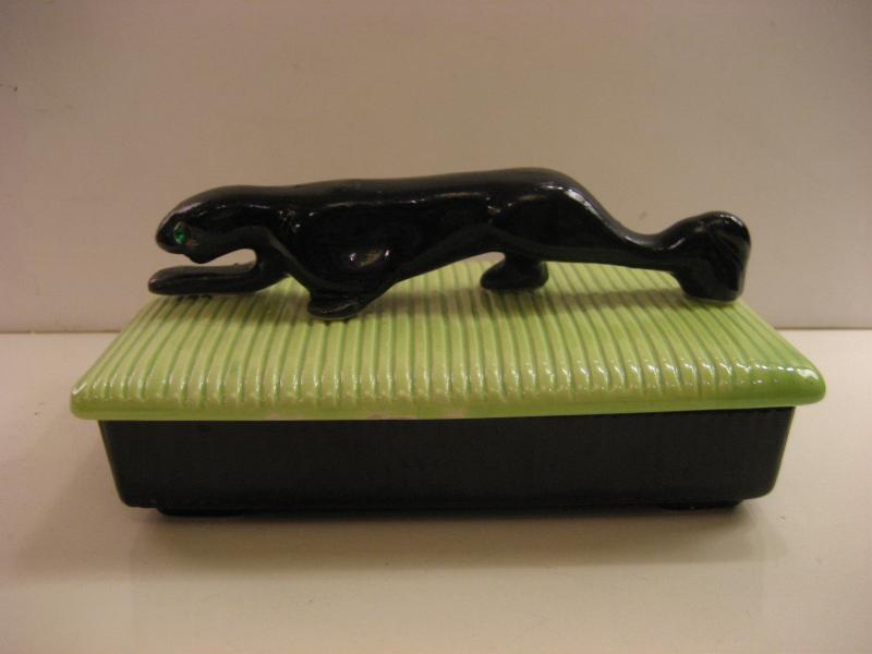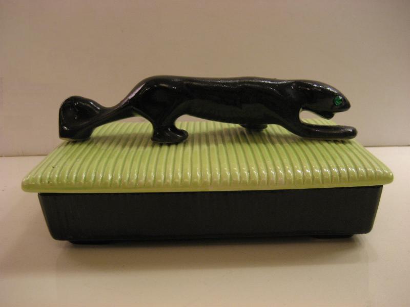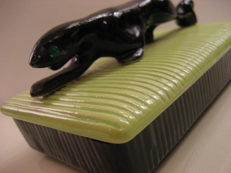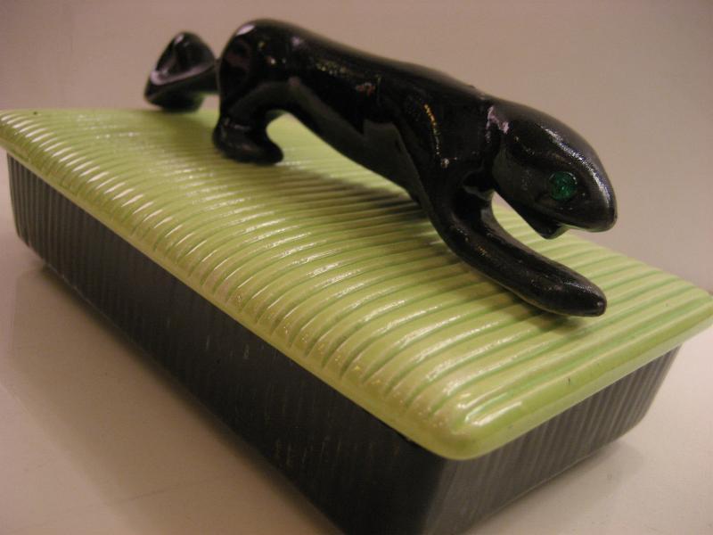 | ビンテージブラックパンサーボックス / 50年代 USA. カリフォルニア陶器メイドの黒豹カバー付きボックス。ブラックベースにオリエンタルライムグリーンカバー、グリーンガラスEYEのブラックパンサーアクセント。シガレットや小物入、ディスプレイにもクールでGOODなビンテージピース! |