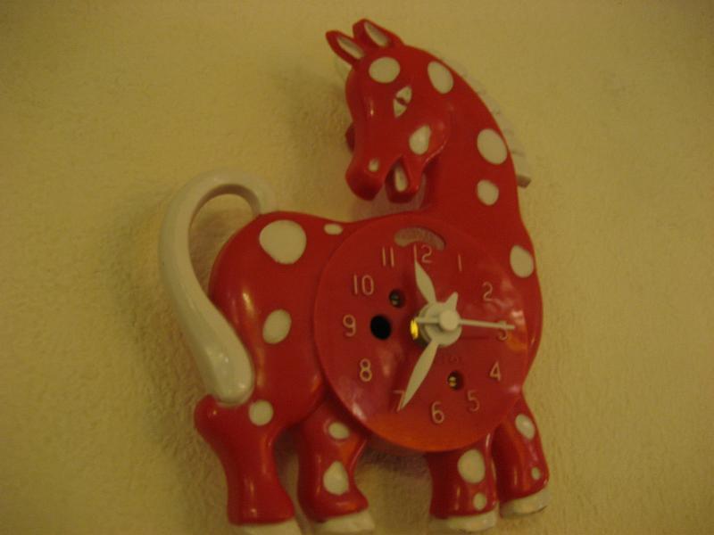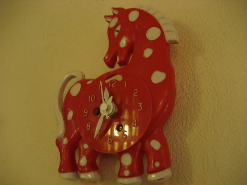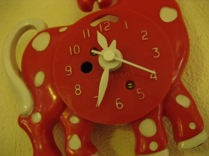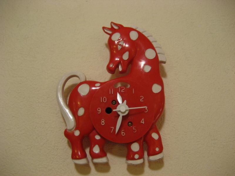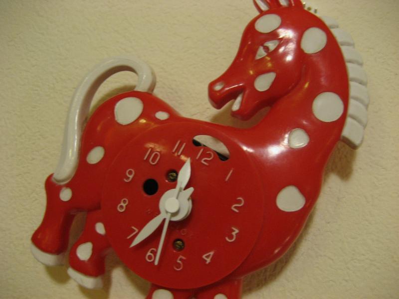 | ビンテージウォールクロック / 50年代 ウェストクロックス社, MADE IN USA ホース(ポニー?)シェイプのビンテージ壁掛け時計。レッドベースにホワイトドット柄がとってもキュート!文字盤の数字もとても見やすく、子供部屋やキッチンなどにもぴったり!時間を見るのが楽しくなるキュートでGOODなビンテージタイムピース! ムーブメントはバッテリータイプ(単3x1個使用)に交換済みですので時間も正確です。 |