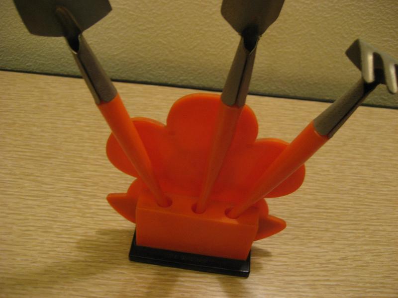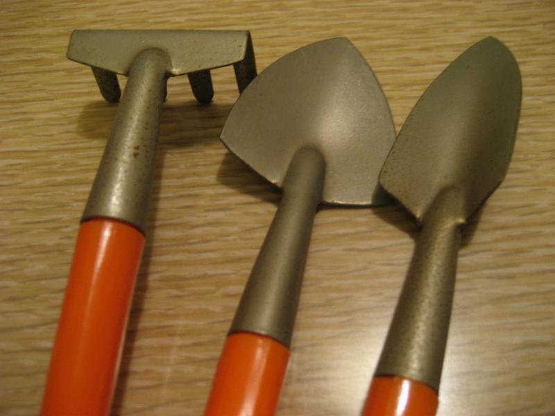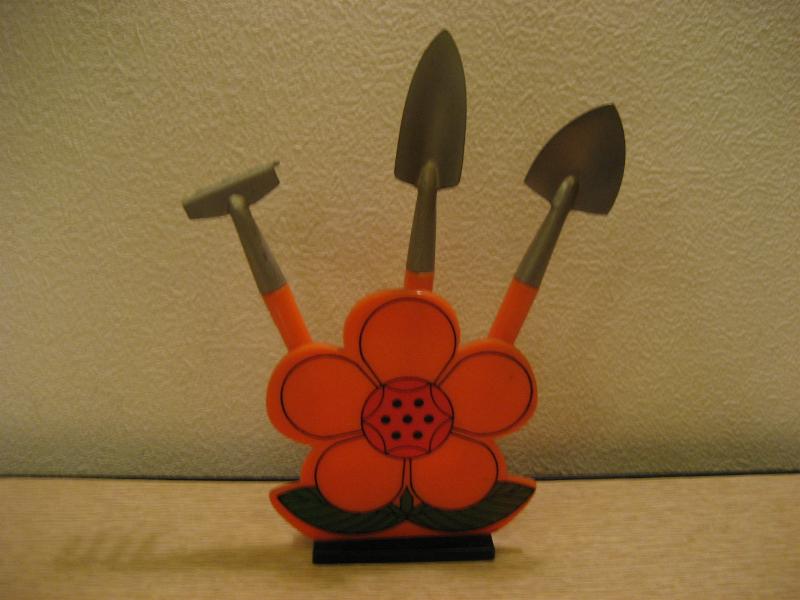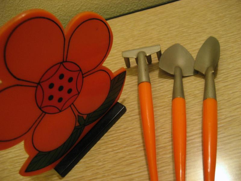 | ビンテージガーデニングセット / 60-70年代 J. SNYDER, NY USA. スモールサイズのキュートなガーデニングセット。サイズ違いのショベル2本と土ならし用のフォーク1本の3本セット。フラワーシェイプのスタンド付き。プランターなどの入れ替えなどなどに。。。キュートでGOODなビンテージピース! |