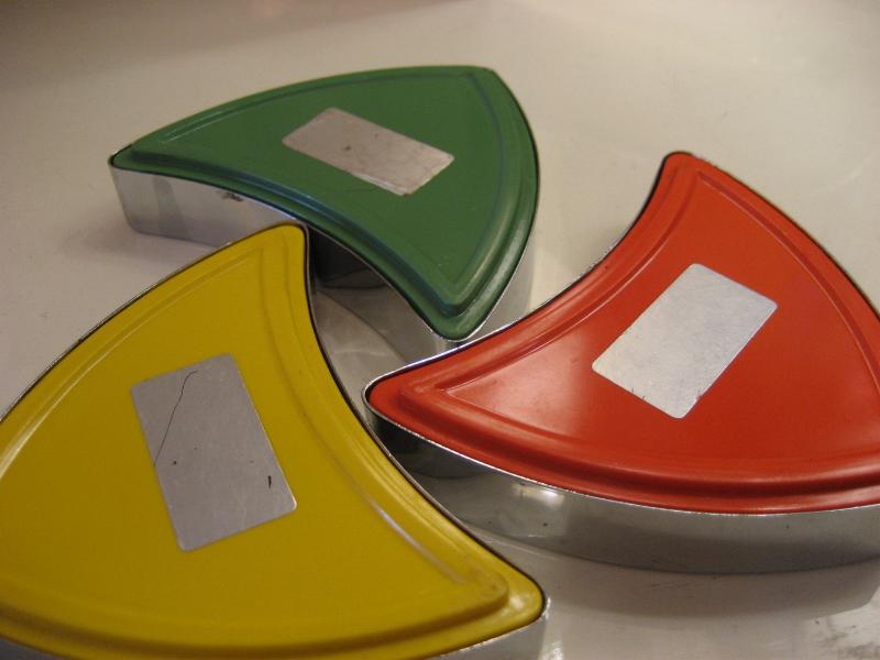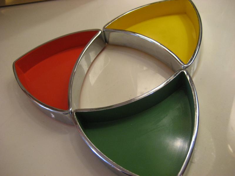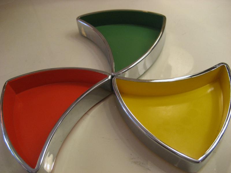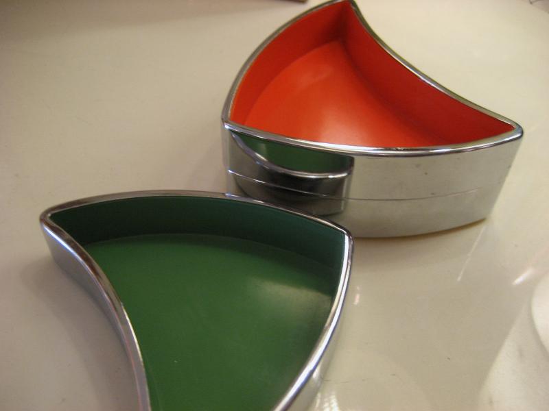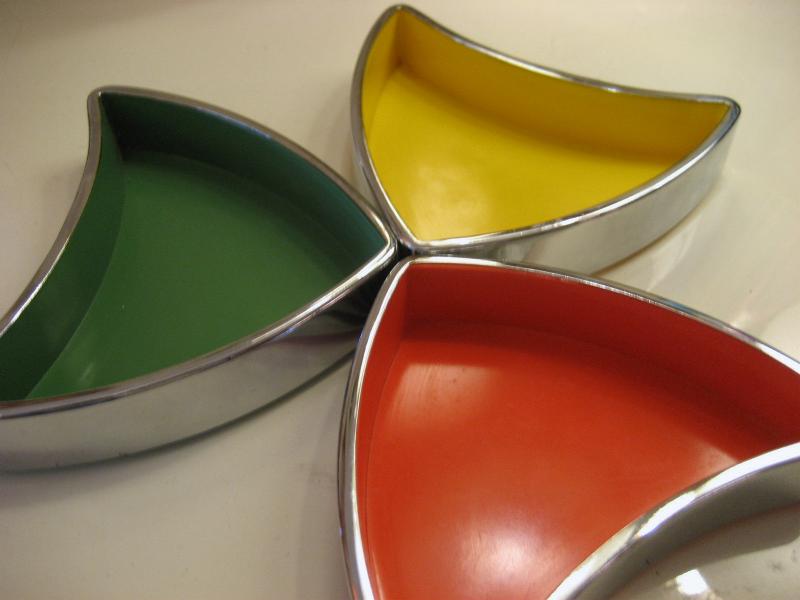 | ビンテージアトミックディッシュセット / 60年代 USA. ブーメランシェイプのビンテージスタッキングディッシュセット。3カラーインサイドにクロームカラーのエッジフレーム。アクセサリーや小物入れ、灰皿などに使っても。。。クールでGOODなビンテージピース! |