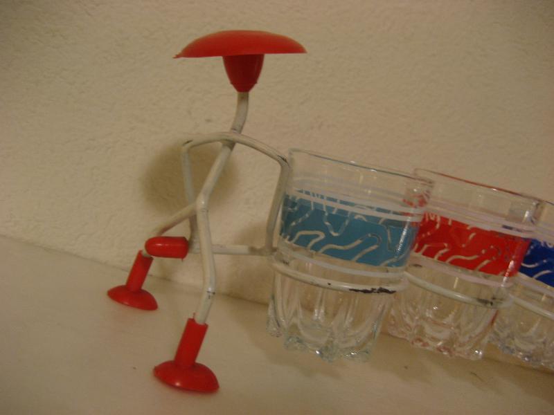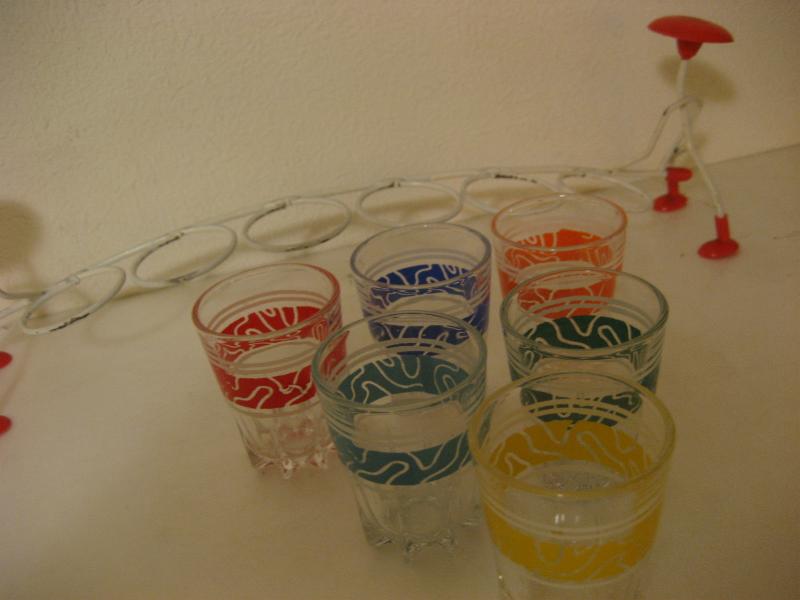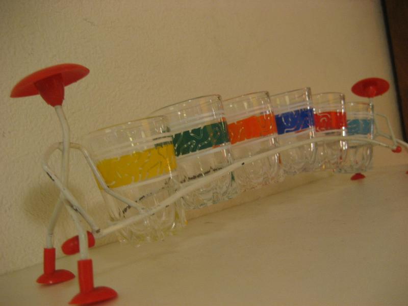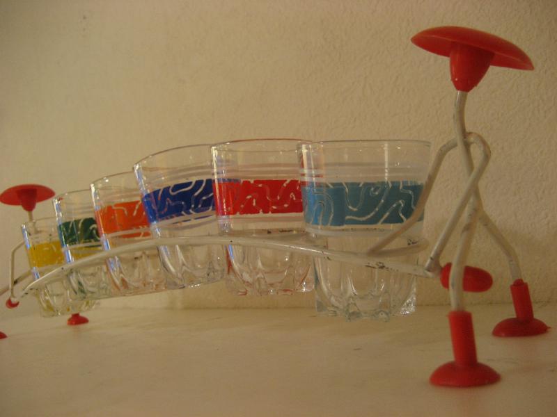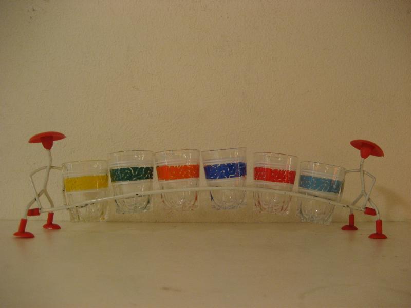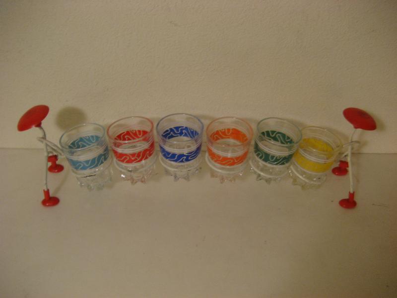 | ビンテージショットグラスセット / 50年代 USA. MADE IN FRANCE. 6カラーのアトミックショットグラスとマッチングラックセット。グラスラックは両サイドでヒトが持っているデザイン。グラス底面に"MADE IN FRANCE"のマークがあります。クール&キュートでディスプレイにもGOODなビンテージピース! |