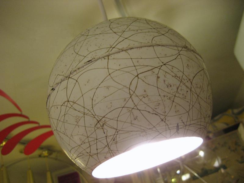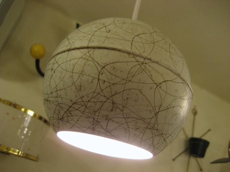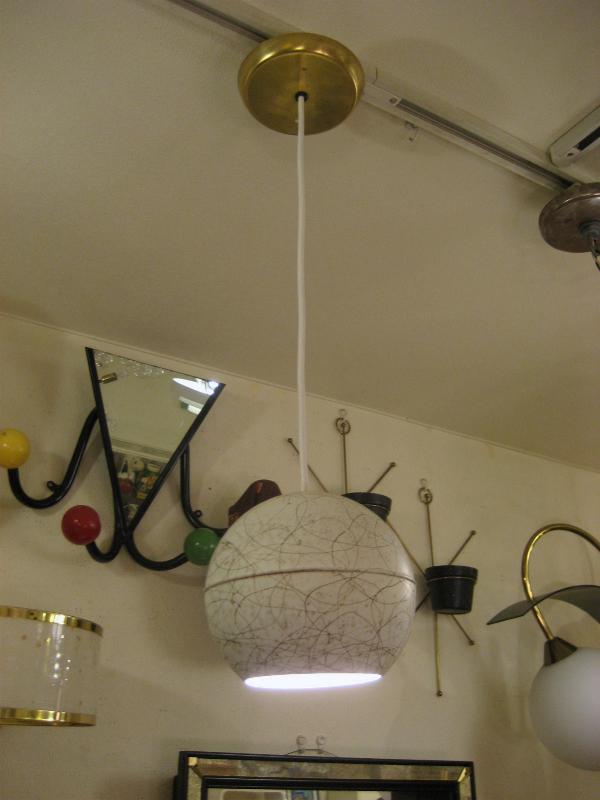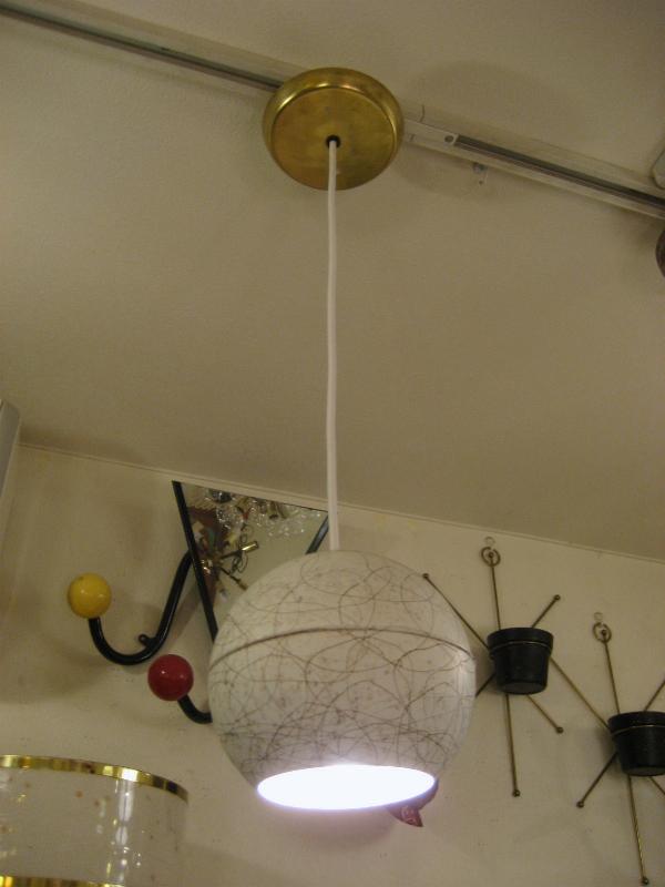 | ビンテージアトミックペンダントランプ / 50-60年代 USA メタルボールシェードのビンテージシーリングランプ。オフホワイトにゴールドドレーピングパターンでバルブはボール球使用。クールでGOODなビンテージライティングピース! 電源は引っ掛けシーリングに交換済みですのですぐに設置OKです。 |