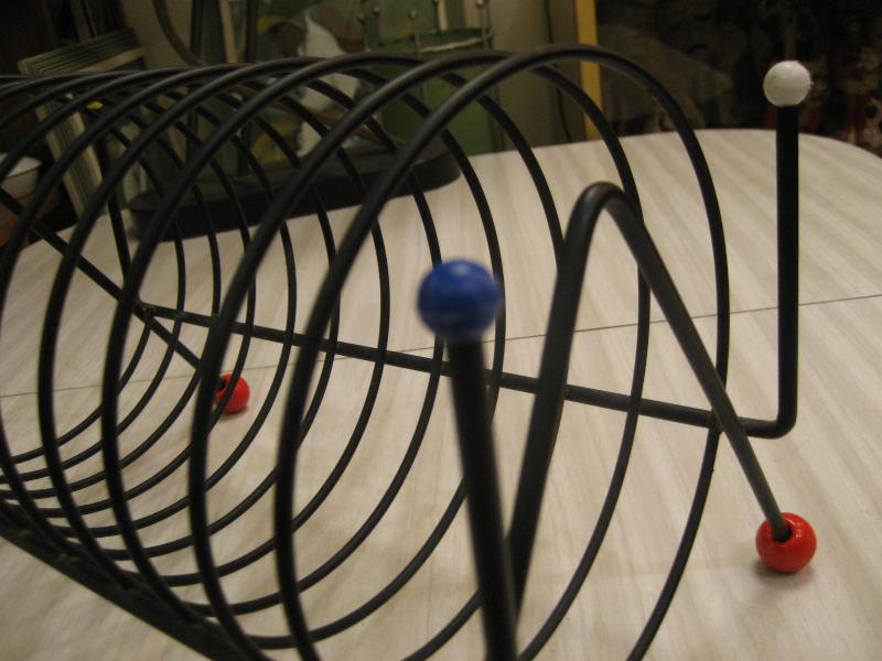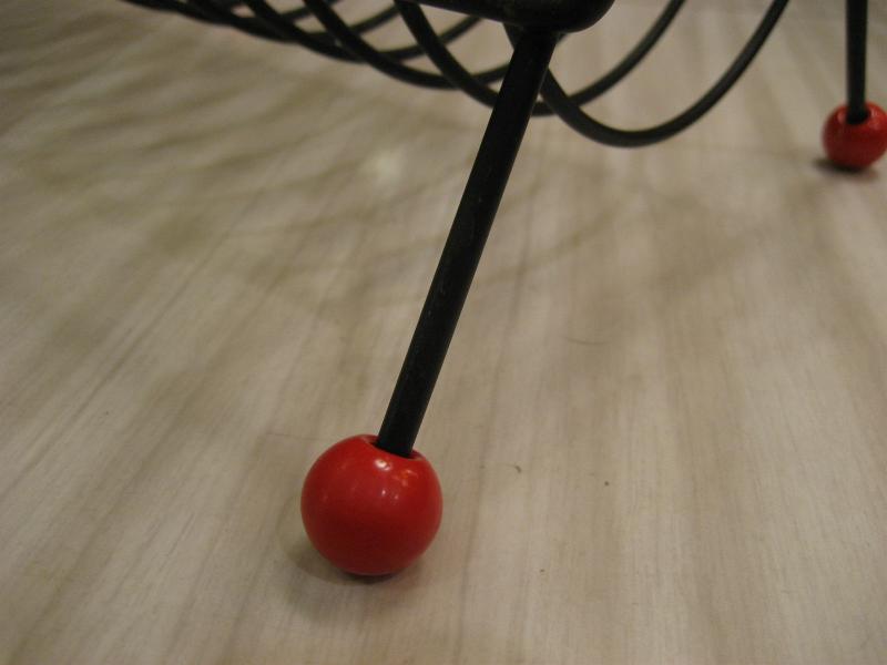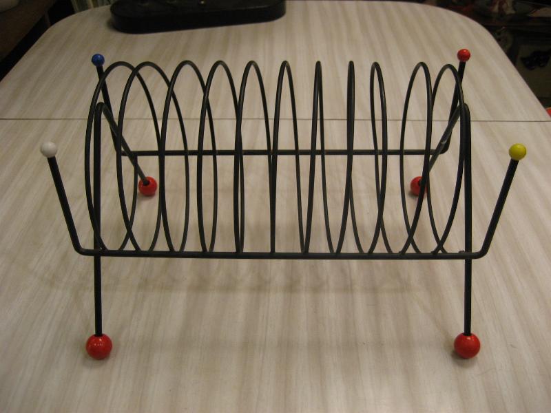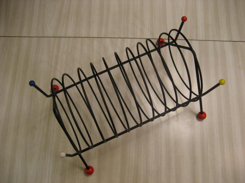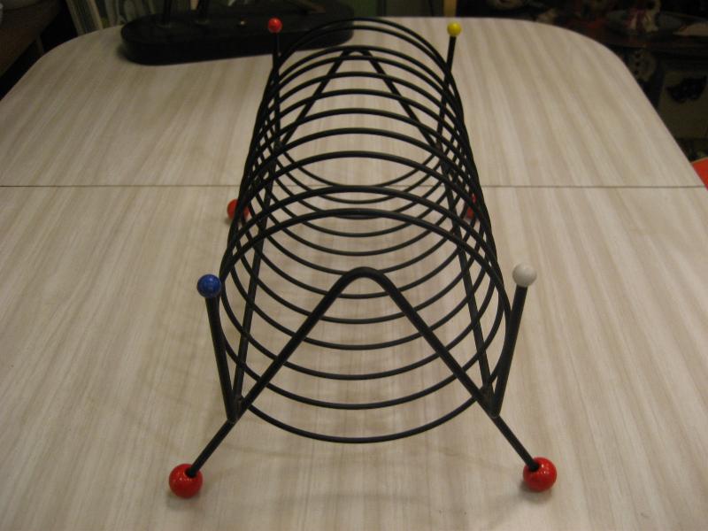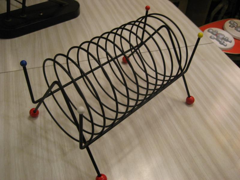 | ビンテージブラックアイアンラック / 50年代 USA. アトミックなスパイラルシェイプのブラックワイヤーメイドラック。レッグ先と両サイドトップにカラーボールアクセントデコ。レコードラックやCD・DVD、キッチンではプレートホルダーなどにも。。。クールでGOODなビンテージピース! |