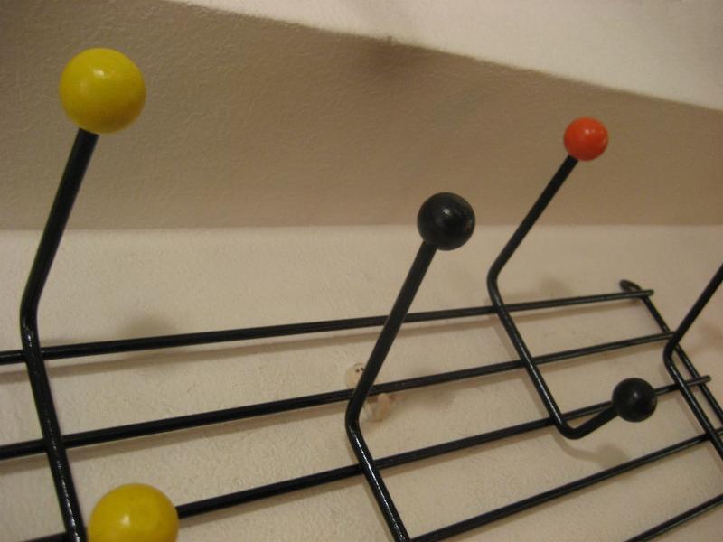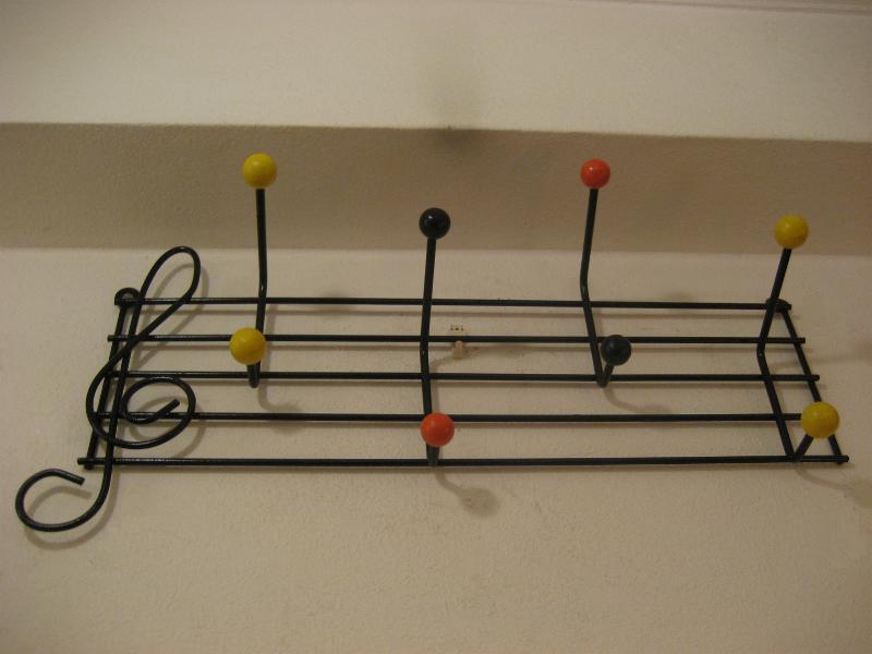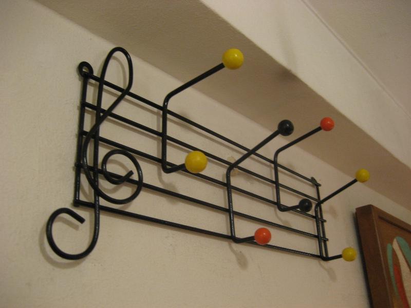 | ビンテージブラックアイアンウォールラック / 50年代 USA. トーン記号に五線譜シェイプのアイアンメイドウォールハング。4本のフック先端はカラーボールアクセント。クールでGOODなビンテージウォールピース! |