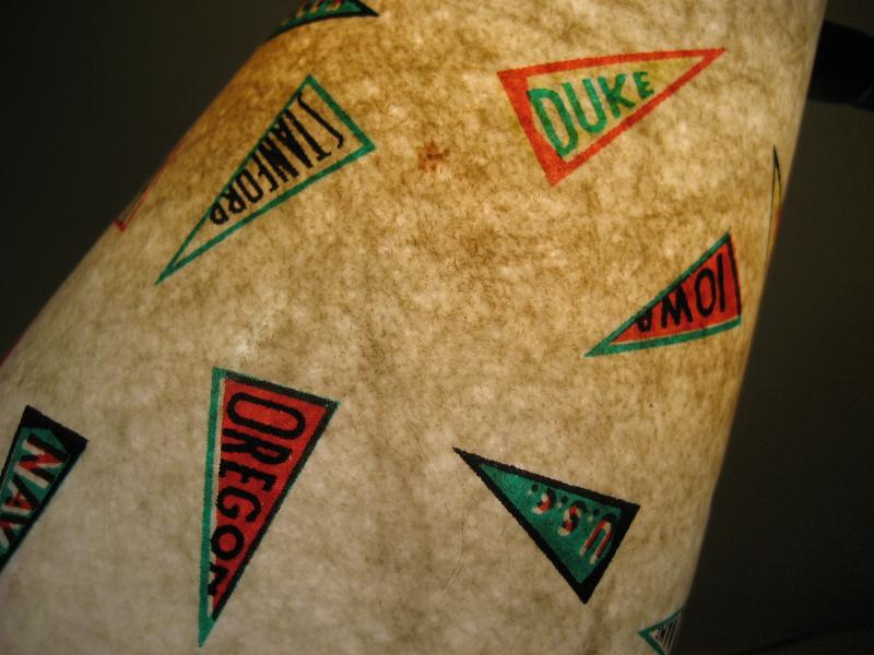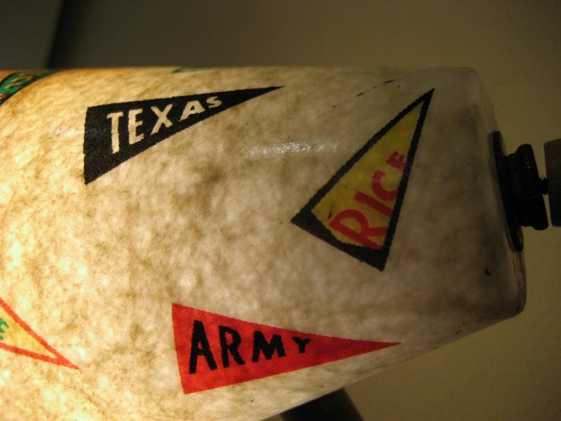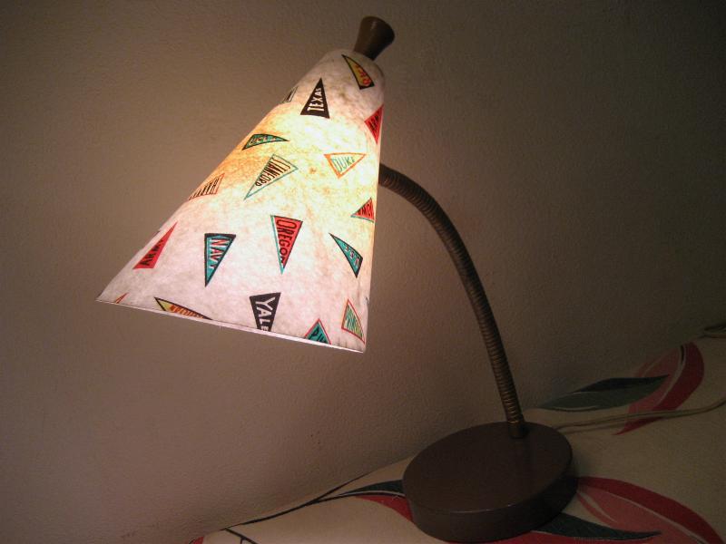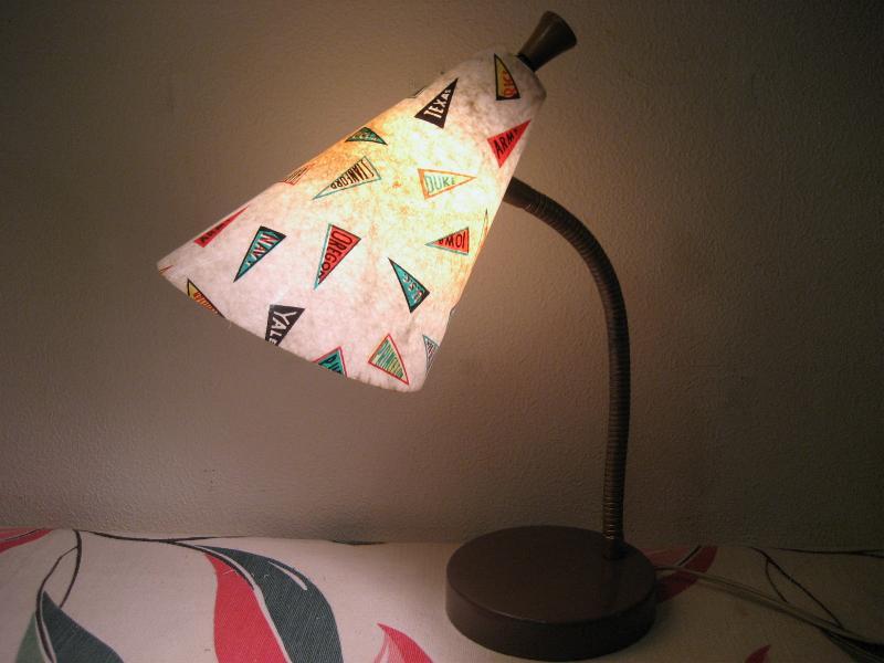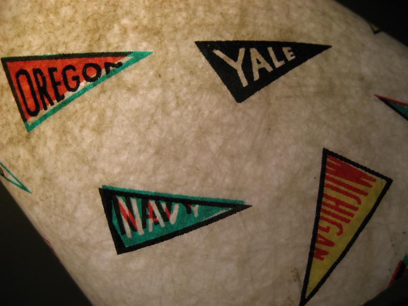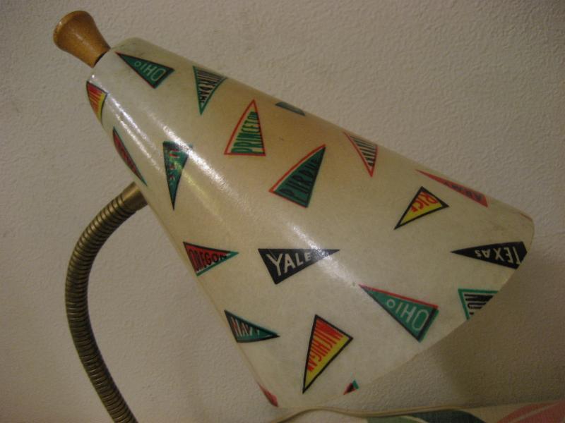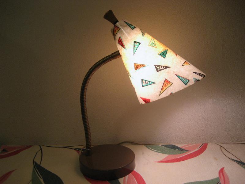 | ビンテージデスクランプ / 50年代 USA フレキシブルアームのビンテージランプ。ファイバーグラスメイドのシェードで"YALE"、"NAVY"、"ARMY"などレアなオールドカレッジペナント絵柄がプリントされています。アーム方向はかなり自在に調節可能ですからいろいろなスタイルで楽しめるクールでGOODなビンテージライティングピース! 電源は家庭用コンセント対応コードで、スイッチはシェード後部に付いています。 |