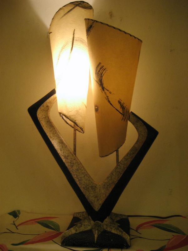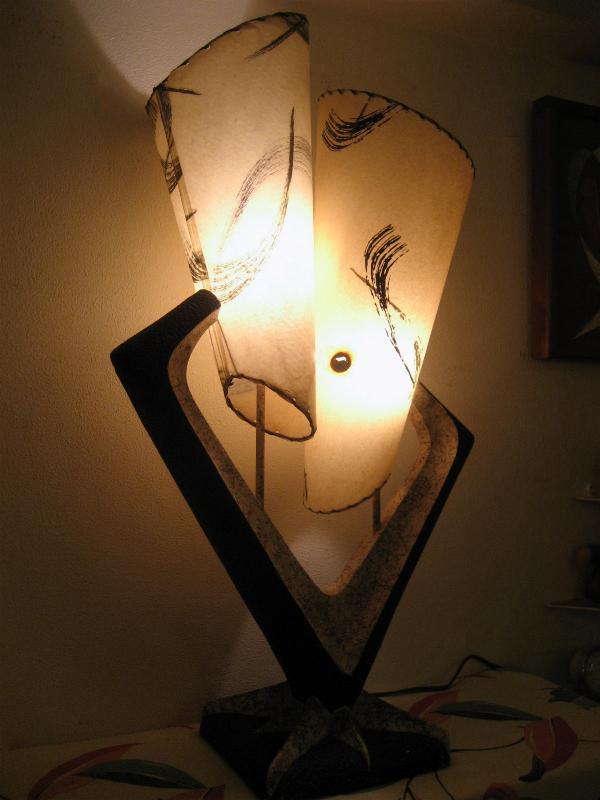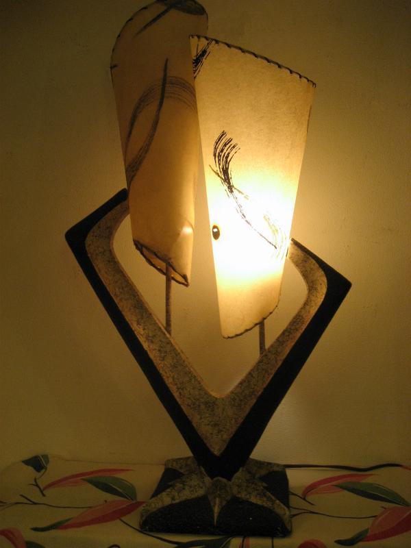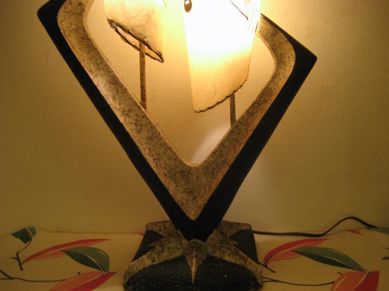 | ビンテージアトミックシェードランプ / 50年代 USA ダブルシェードのビンテージシェードランプ。ビンテージランプを紹介している洋書「Lamps of the 50s & 60s」の表紙に掲載されているレアシェードランプ。チョークメイドのランプベースにツインのコーンシェイプファイバーグラスシェード。クールでGOODなビンテージライティングピース! 電源は家庭用コンセント対応コードでスイッチはランプベースに付いています(3WAYタイプ)。 |