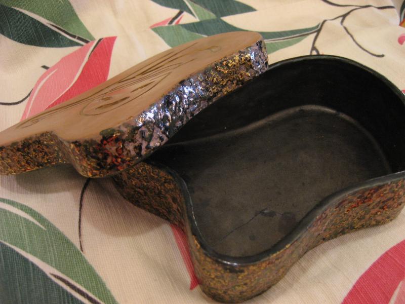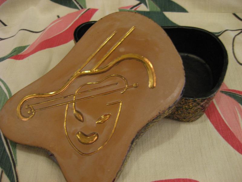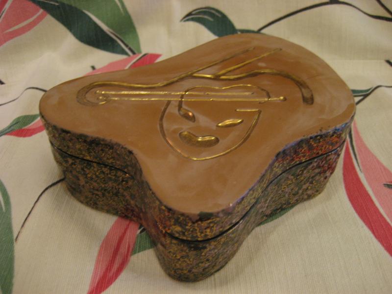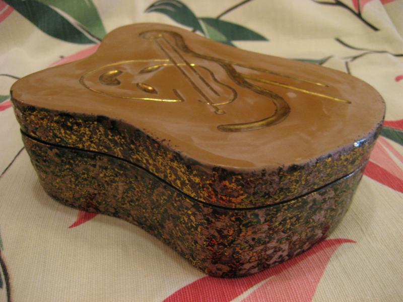 | ビンテージカバーボックス / 40-50年代 へディスクープ USA. レアなヘディスクープ社のカバー付きディッシュ。カバートップにツーフェイスの笑い顔と楽器のモチーフが掘り込まれています。側面はブラックベースにゴールドとグリーンのまだら模様。クールでGOODなビンテージコレクティブルピース! |