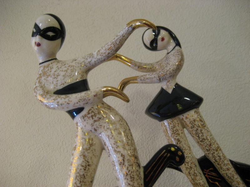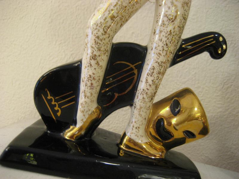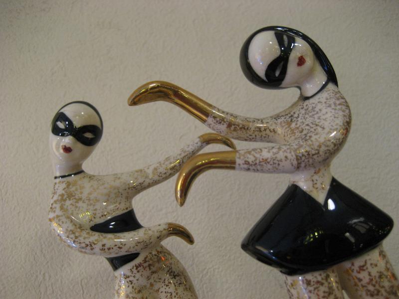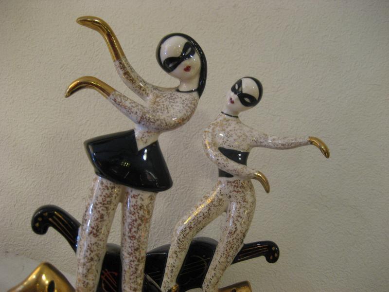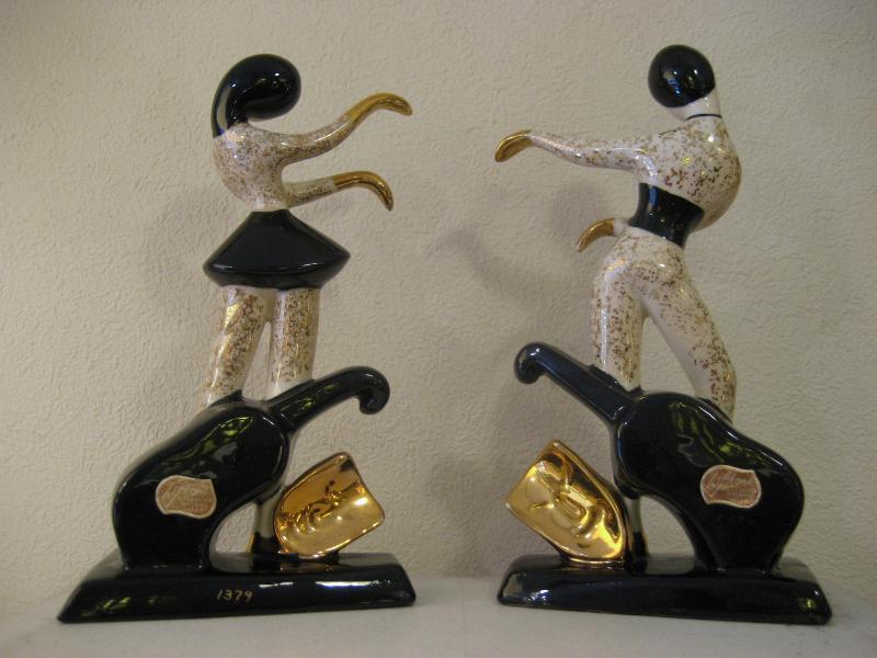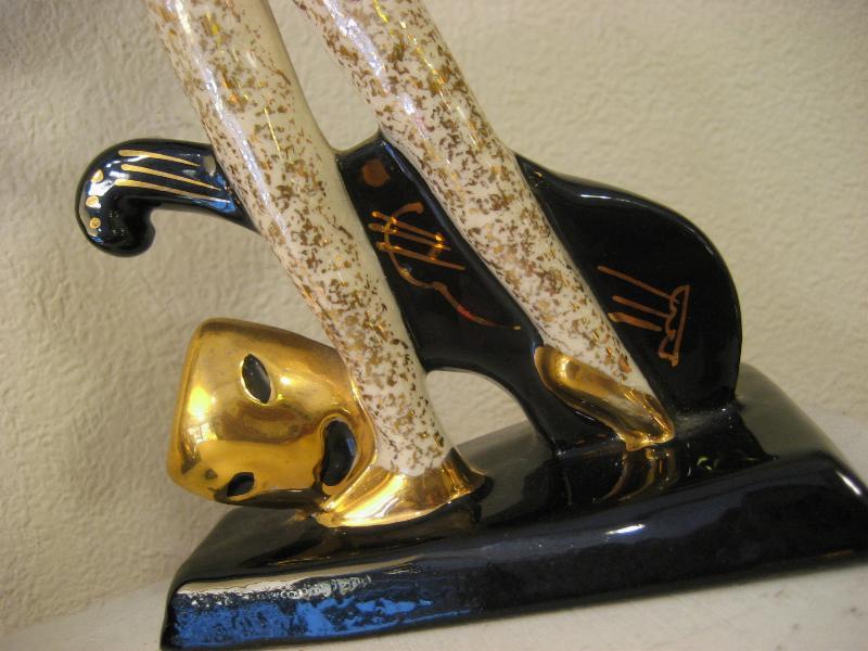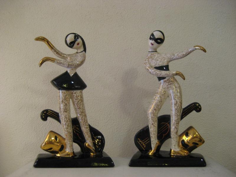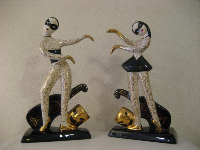 | ペアビンテージハーレクインデコ / 50年代 Lefton, USA レアなレフトン社のハーレクインダンサーペア。陶器メイドで白黒金カラー。それぞれ足元には楽器とツーフェイスのアクセントデコレーション。 クールでGOODなビンテージデコレーションピース! |