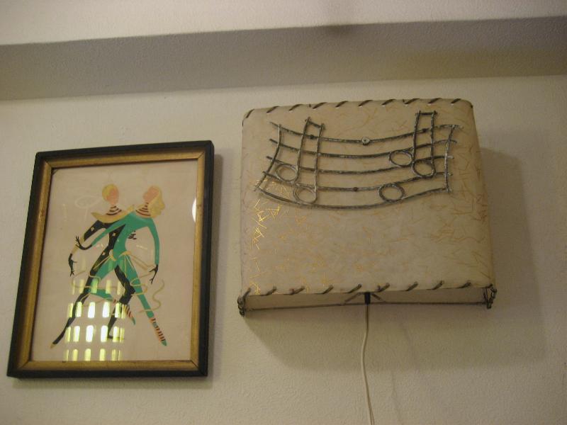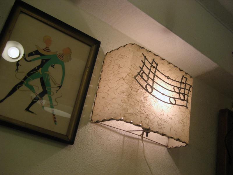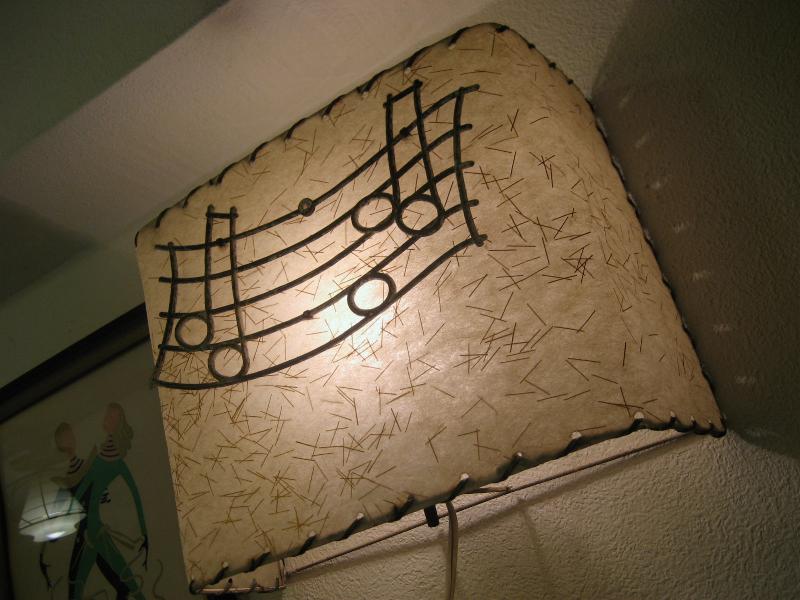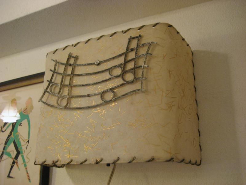 | ビンテージウォールランプ / 50年代 USA. 音符デコレーションのビンテージ壁掛けシェードランプ。シェードはファイバーグラスメイドでゴールドフレークアクセント。クールでGOODなビンテージライティングピース! 電源は家庭用コンセント対応でスイッチはバルブソケット下部分に付いています。 |