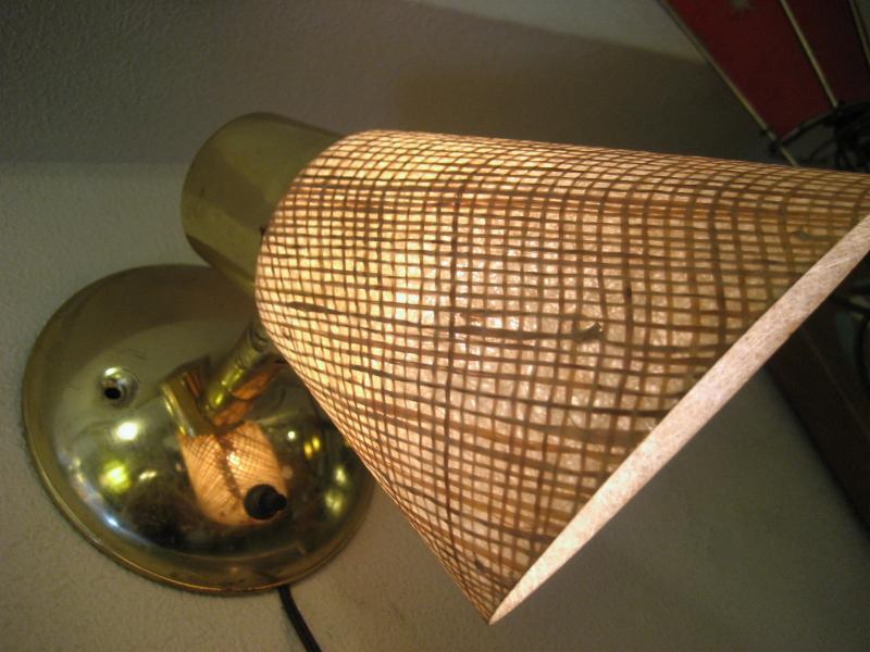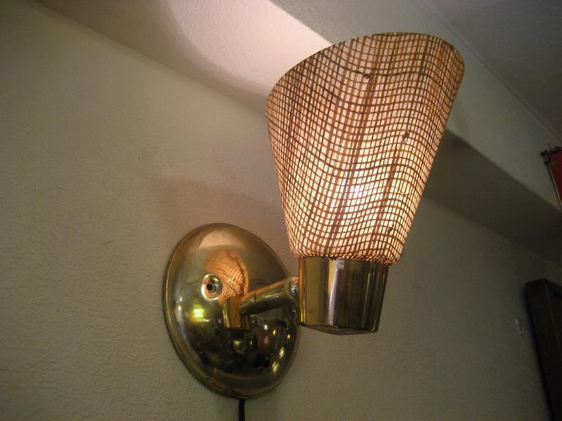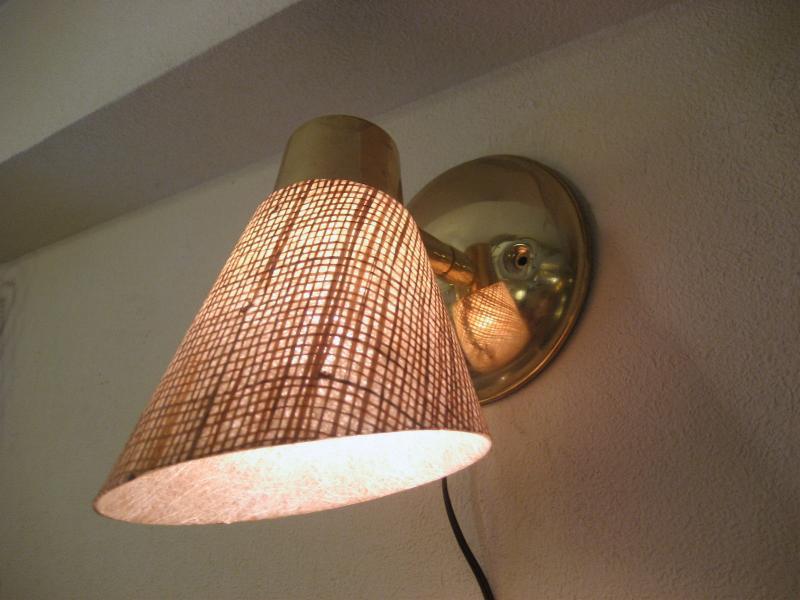 | ビンテージウォールランプ / 50-60年代 USA ファイバーグラスシェードにゴールドブラスのビンテージ壁掛けスポットランプ。シェード方向は好みに合わせて360度可動しますので、いろいろなポジションに対応。クールでGOODなビンテージライティングピース! 電源は家庭用コンセント対応でスイッチはウォールマウントベースに付いていてロータリー式(ON/OFF)です。 |