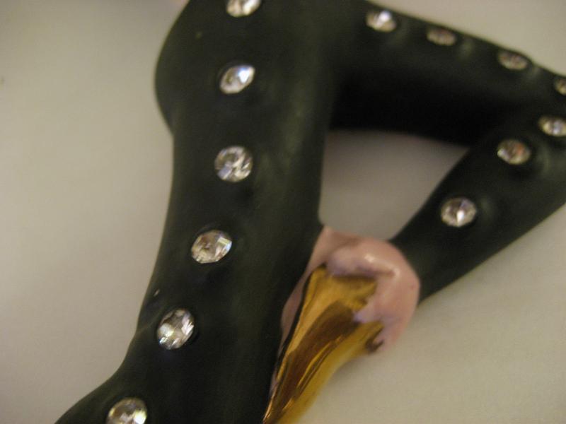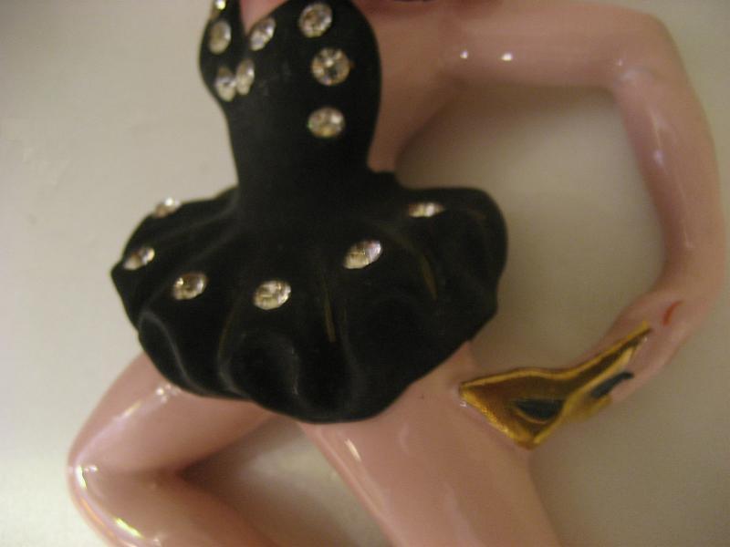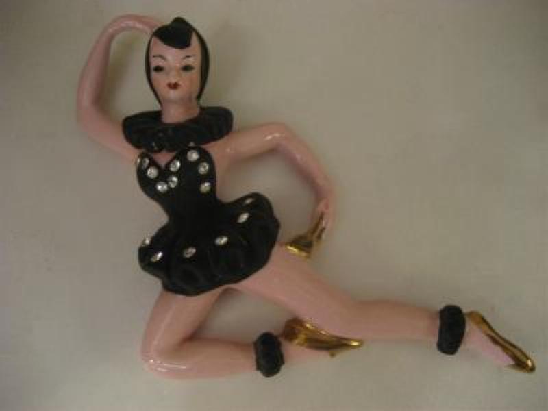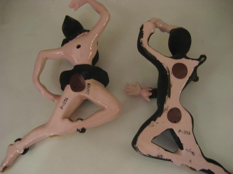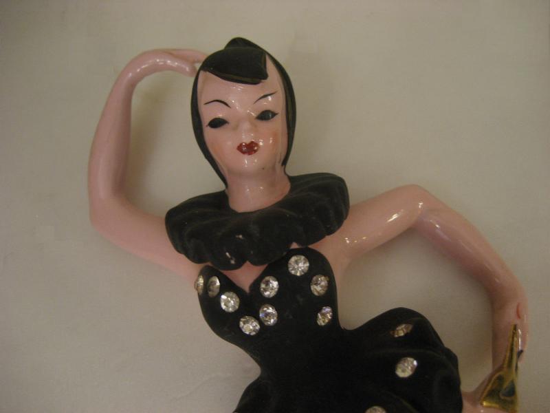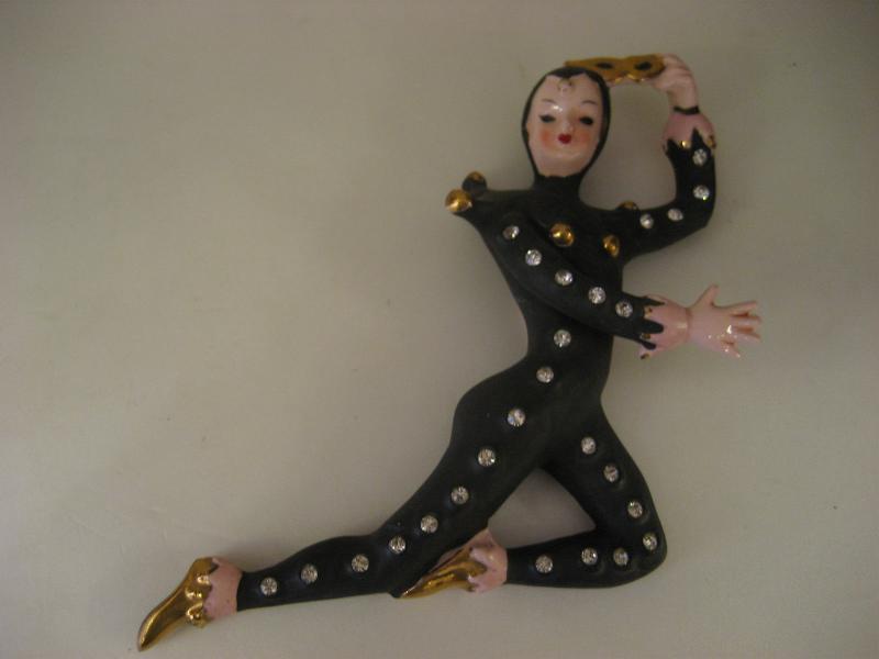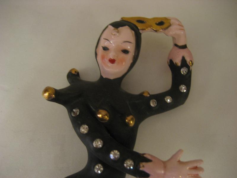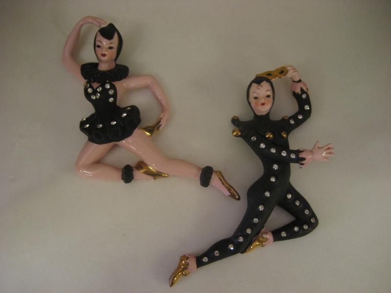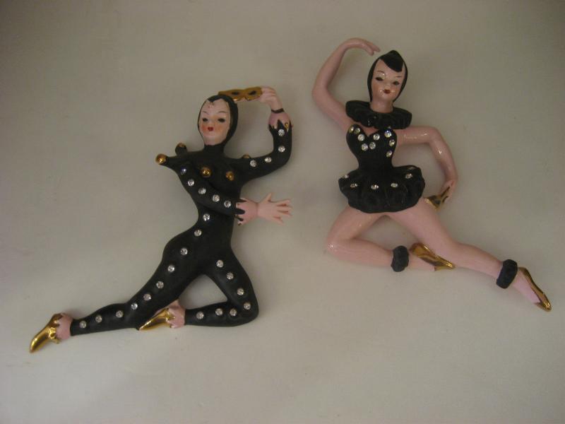 | ペアビンテージハーレクインウォールデコ / 50年代 Norcrest, USA. 陶器製クロピンカラーのレアなペアハーレクインダンサー壁掛け。ブラックコスチュームにラインストーンアクセントデコ、それぞれ手にゴールドマスク。クールでGOODなビンテージ50'sコレクティブルピース! ※写真ではわかりにくいですがボディはピンクカラーです |