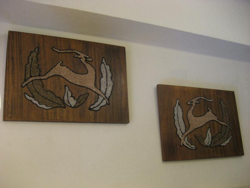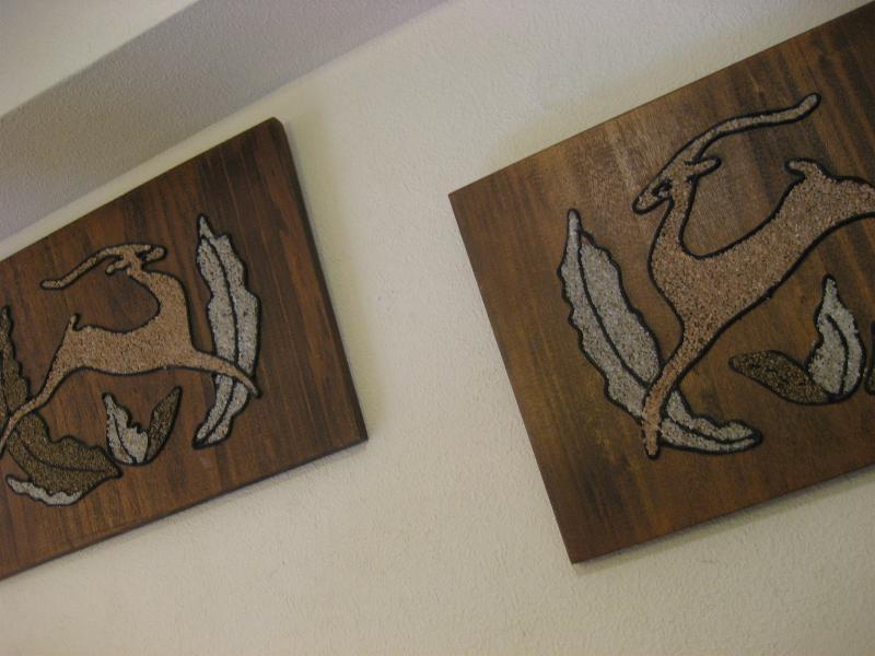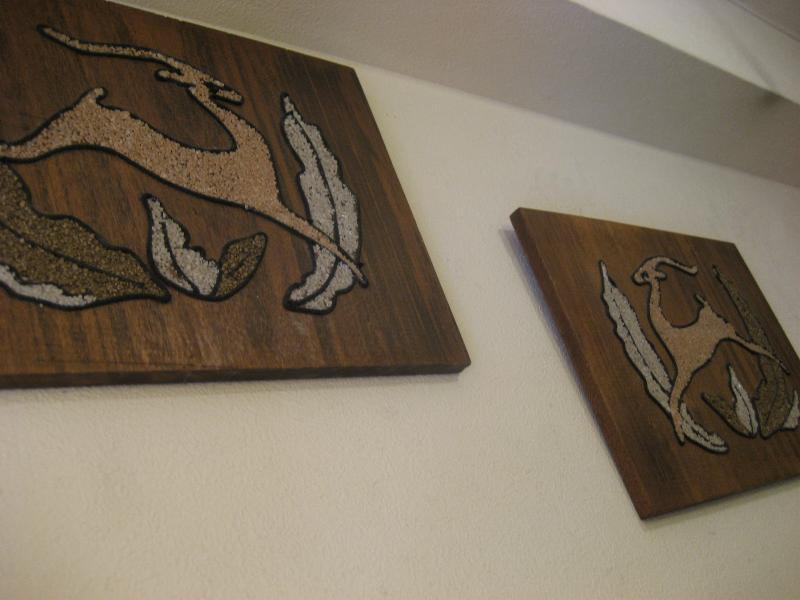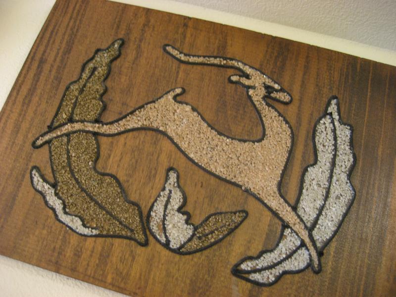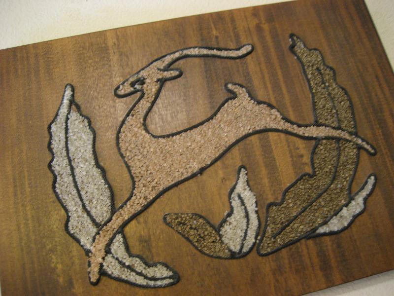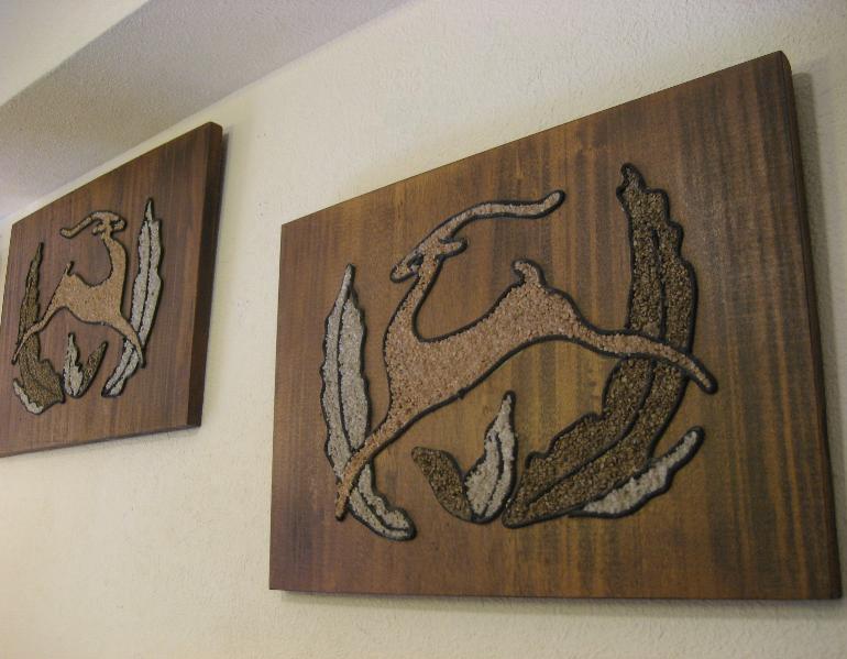 | ペアビンテージウォールデコ / 50-60年代 USA. 50'sの定番アニマルキャラクターのひとつでもあるガゼル(鹿のように見えますがウシ科の動物)のビンテージ壁掛け。ウッドベースにカラーロック(砂絵)とカラーコードでデコレーションされています。クールでGOODなウォールデコレーションピース! |