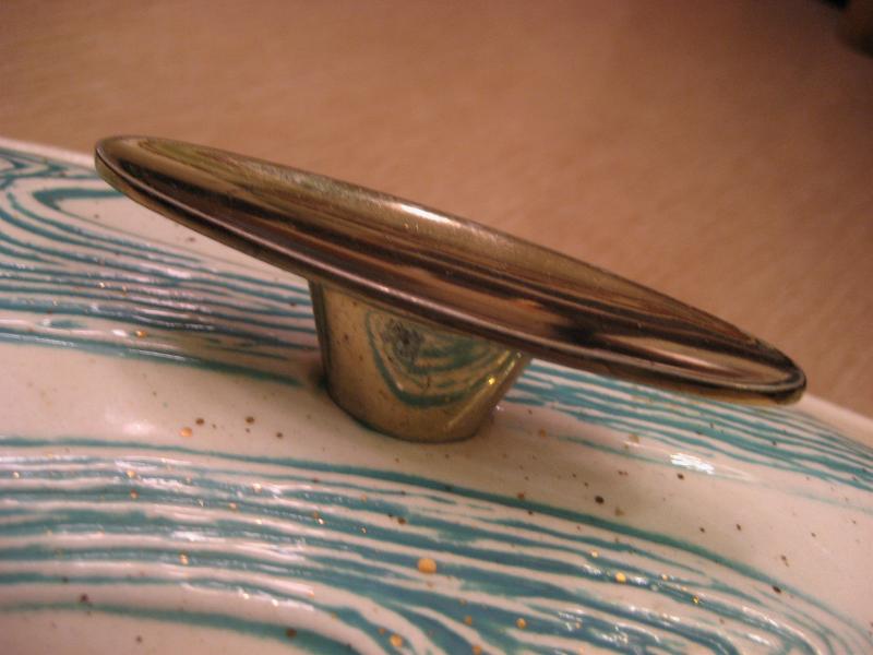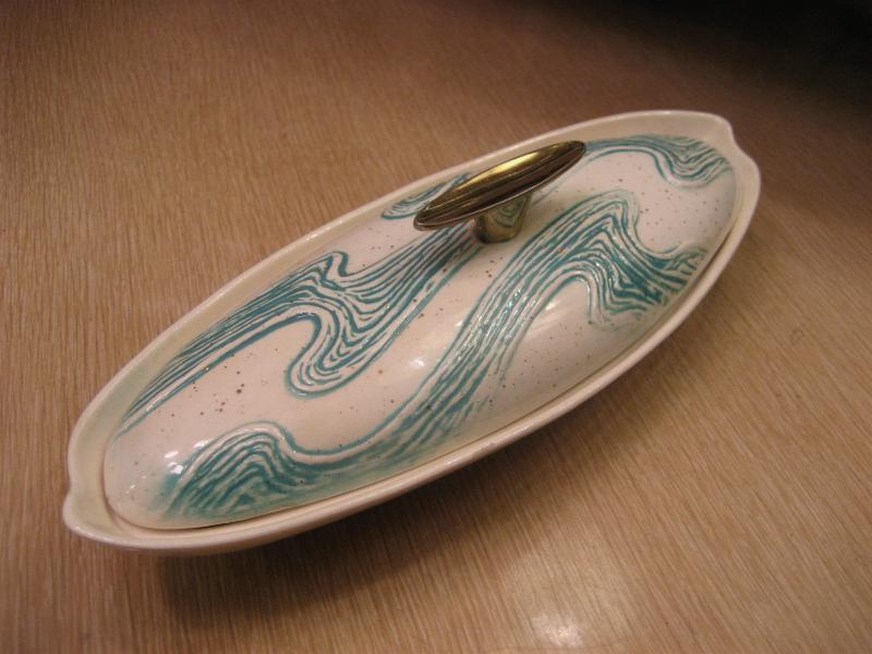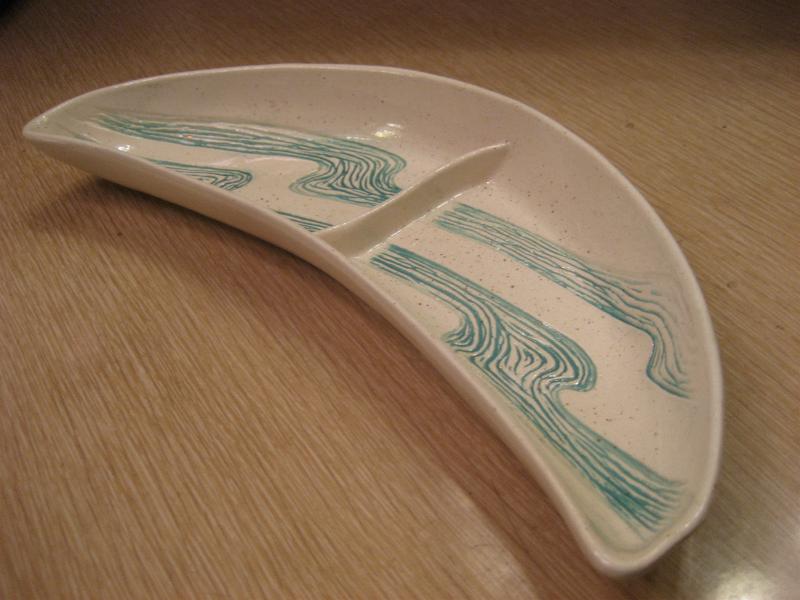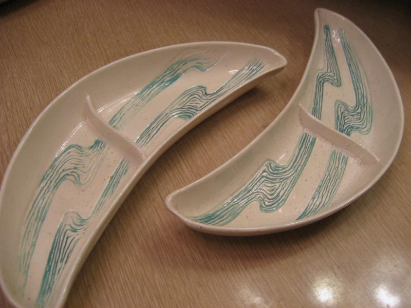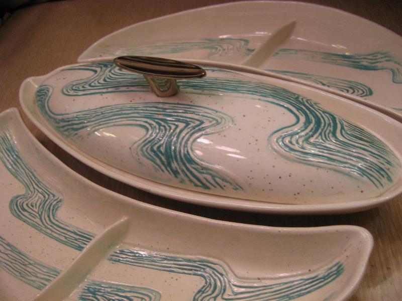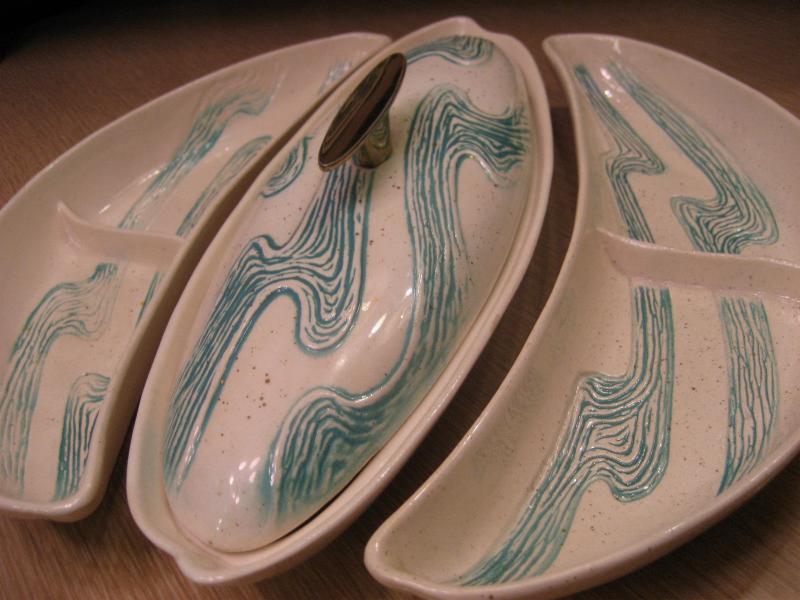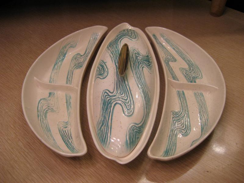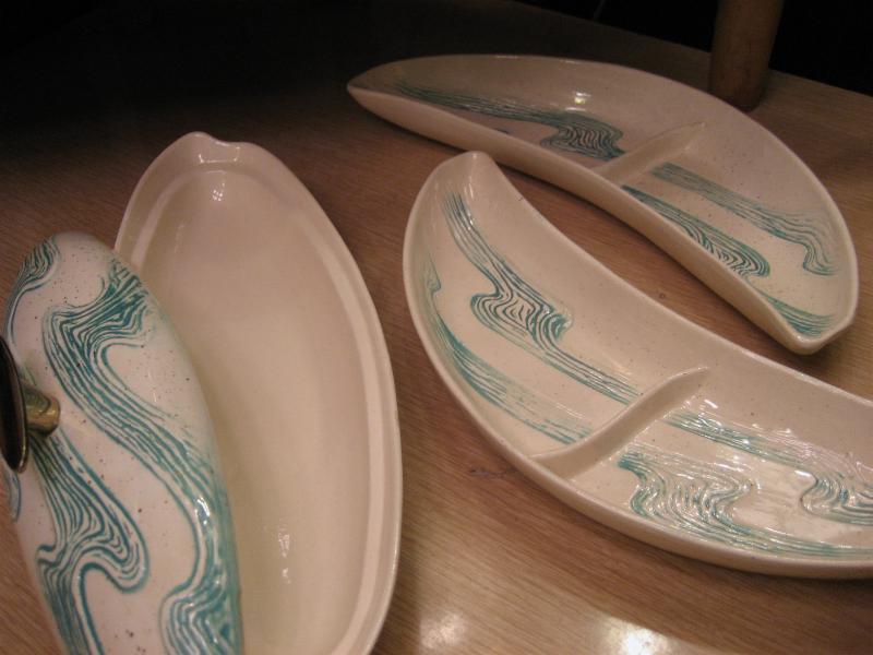 | ビンテージブーメランディッシュセット / 50年代 BELL MFG, USA. カリフォルニア陶器の代表的なメーカー "BELL MFG CO" のブーメランシェイプディッシュ3PCセット。センターのカバーディッシュにサイドの仕切り付きブーメランディッシュが2点。アイボリーにゴールドフレークベースでグリーンのウェーブ柄。料理やスナックはもちろん、灰皿や小物入れなどやテーブルトップディスプレイにもクールでGOODなビンテージテーブルピース! |