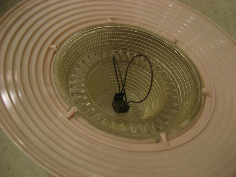 MFG CORP. USA 天井シーリングバルブに付けるランプシェード。アクリルメイドでやさしいベビーピンクとクリアカラーのコンビネーション。アトミックなUFOシェイプのクールなデザイン。写真のいちばん下のように電球(バルブ)にクリップオンするだけのイージー&クイック設置でシーリングランプにチェンジ! キッチン、バスルームやトイレ、玄関などなど。。。お家のどこかに電球バルブのみのところがきっとあるはず。。。そんなスポットにおススメです。アクリルカット面の光の屈折反射で独特な明かりを再現しています。クールでGOODなビンテージライティングピース! |