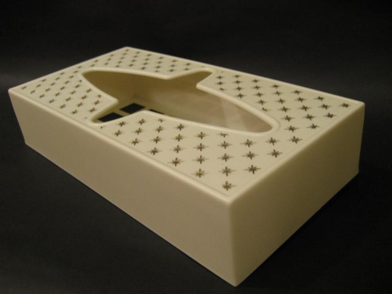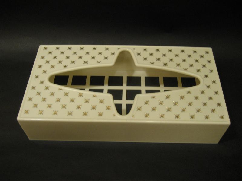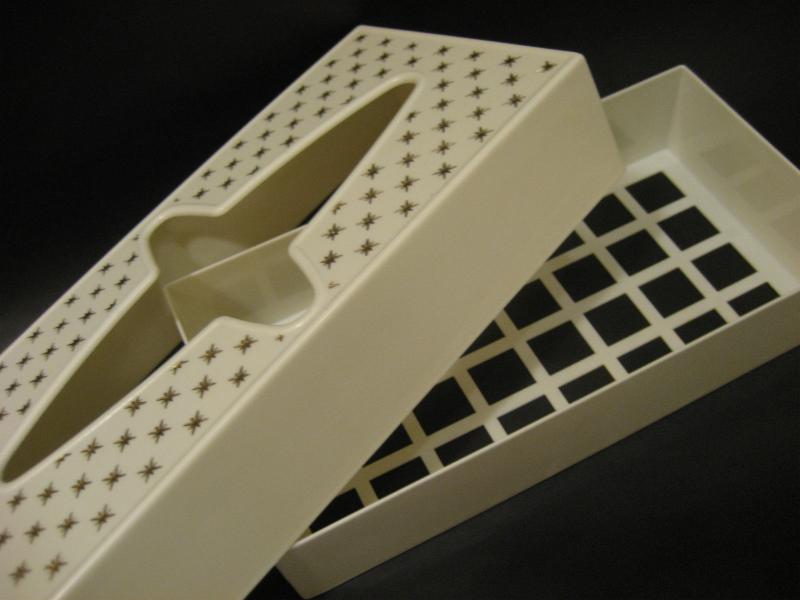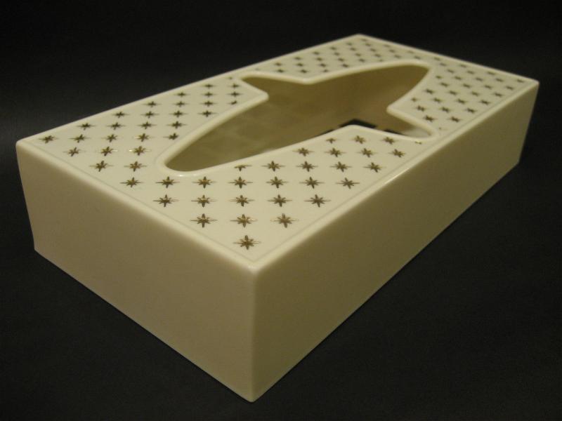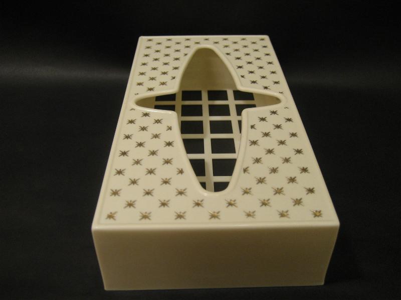 | ビンテージアトミックティッシュケース / 50年代 Rubbermaid, MADE IN USA. アイボリーホワイトボディにゴールドスターバーストプリントの50'sティッシュボックス。取り出し口のアトミックシェイプがクールでGOODなビンテージバニティピース! 底面はメッシュカバーになっています。 |