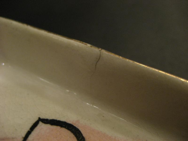 | 特に目立つようなダメージはありませんが、写真(右下)のように1ヶ所小さいクラックが見られます。それ以外は全体的にきれいで良いビンテージコンディションです。 | |