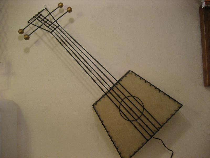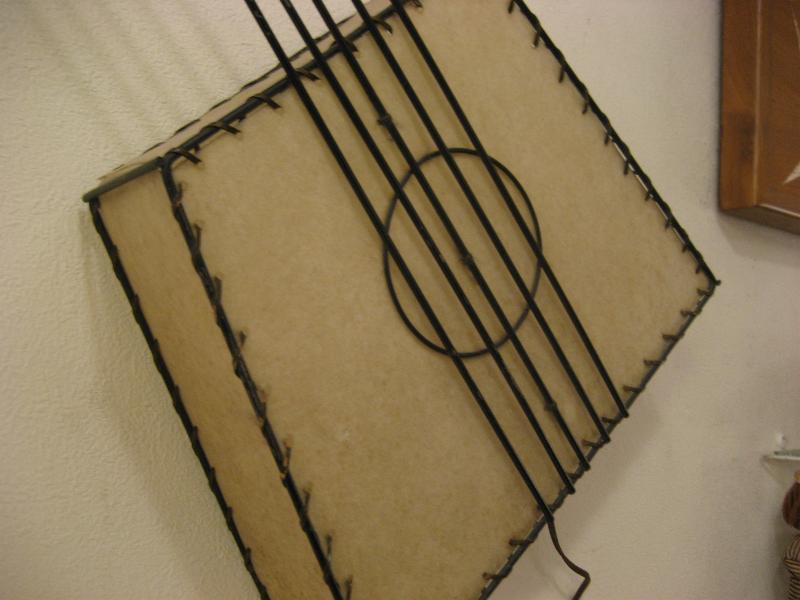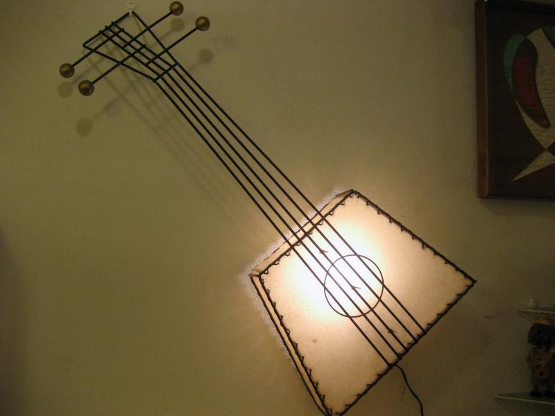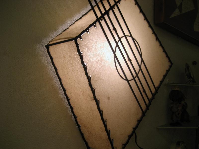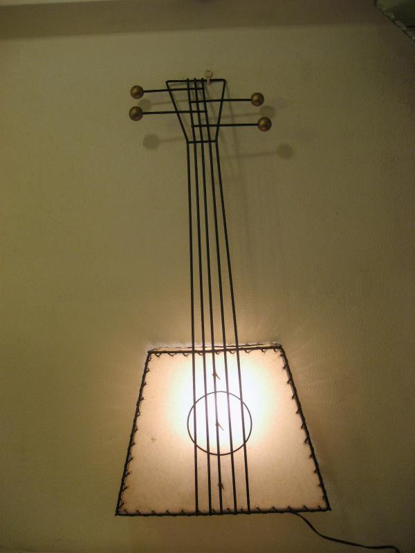 | ビンテージウォールシェードランプ / 50年代 Frederick Weinberg, USA. ワインバーグのスクエアギターシェイプタイプ、超レアなビンテージ壁掛けシェードランプ。ブラックアイアンフレームにシェードはファイバーグラス製。弦の調整ツマミ部分にウッドボールデコレーション。スーパークールでGOODなビンテージライティングピース! 電源は家庭用コンセント対応です。スイッチはシェード内側ソケット部分に付いていてPULLタイプ。 |