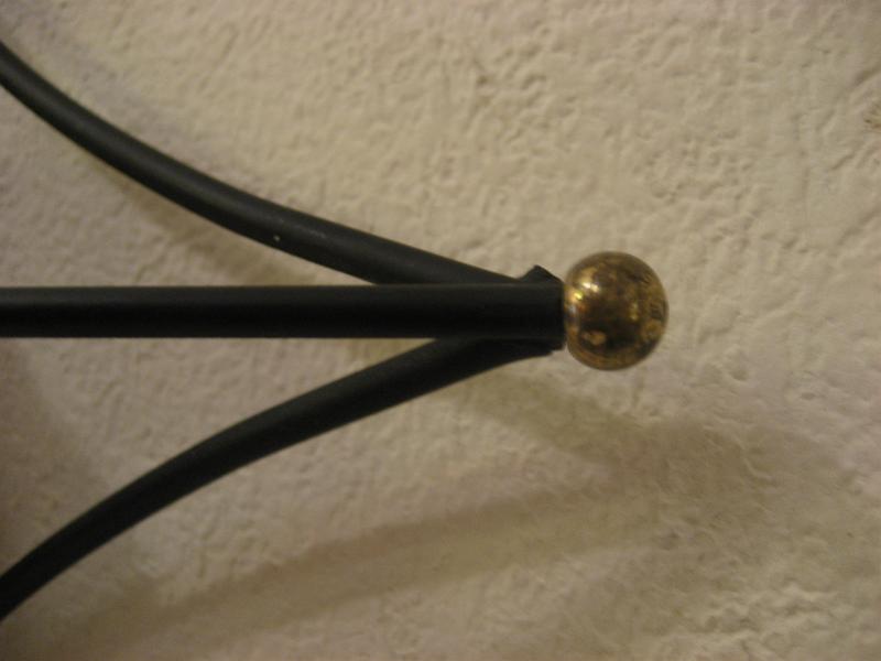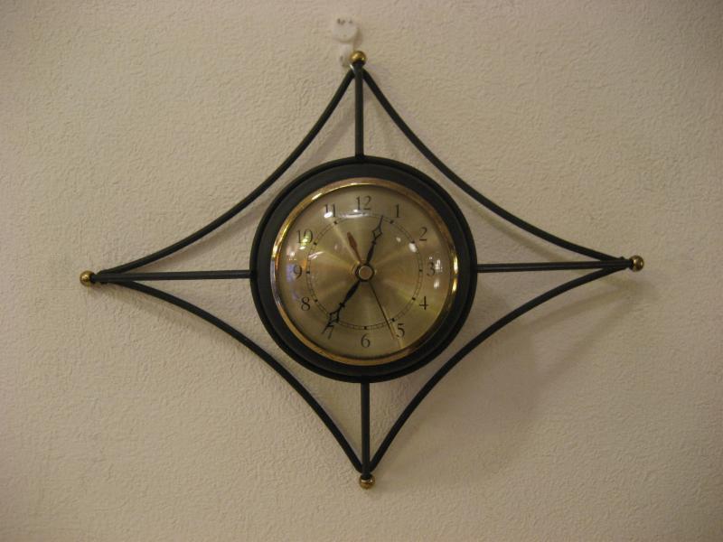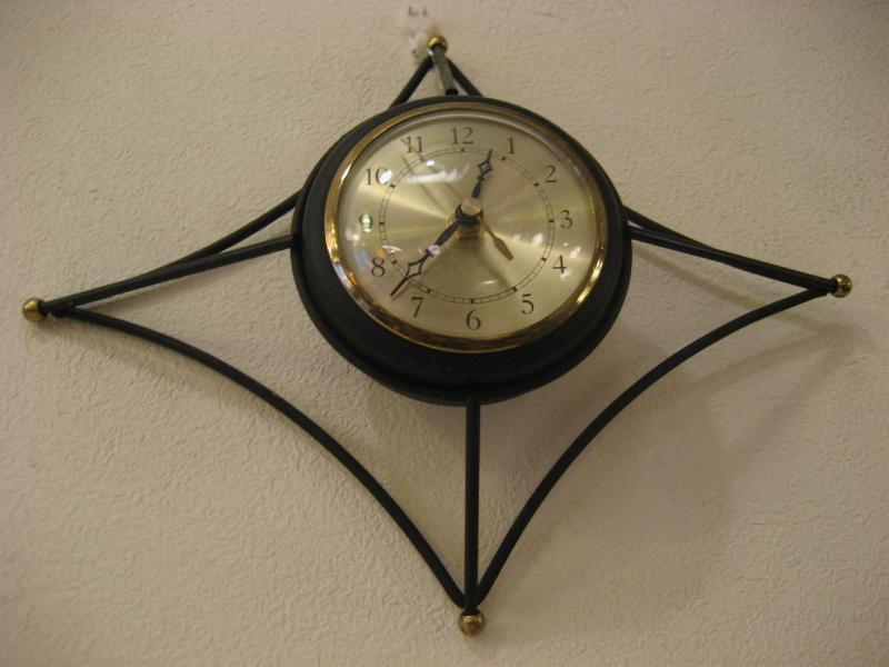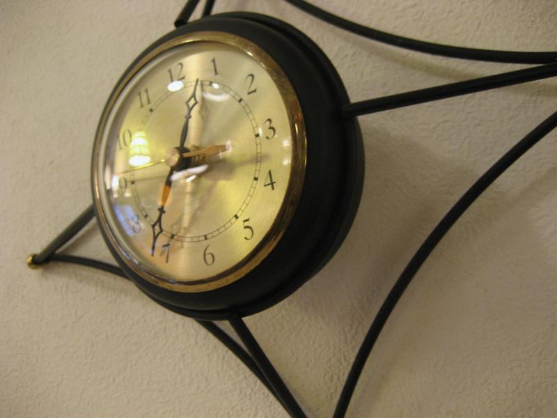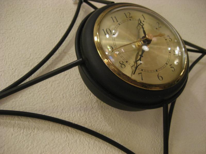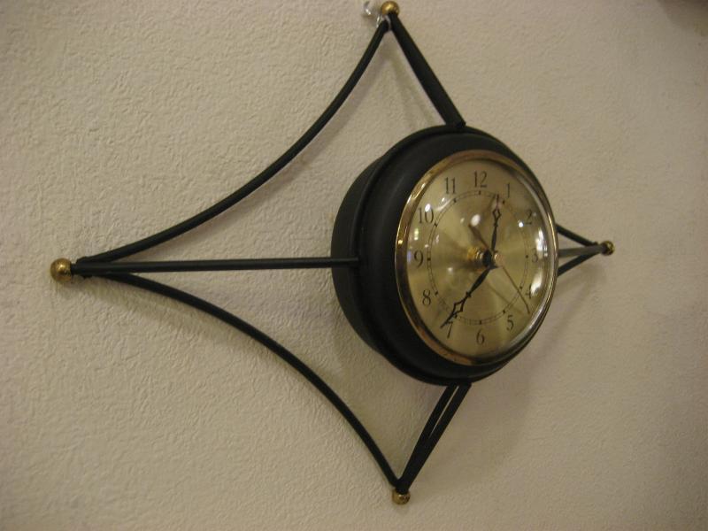 | ビンテージアトミックウォールクロック / 50-60年代 USA. ブラックアイアンメイドのダイヤシェイプフレームがクールなビンテージ壁掛け時計。フレーム先端にゴールドボールアクセント。クールでGOODなアトミックタイムピース! ムーブメントはバッテリータイプ(単3x1個使用)に交換済みですので時間も正確です。 |