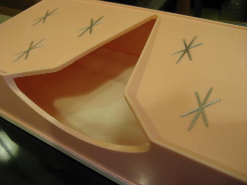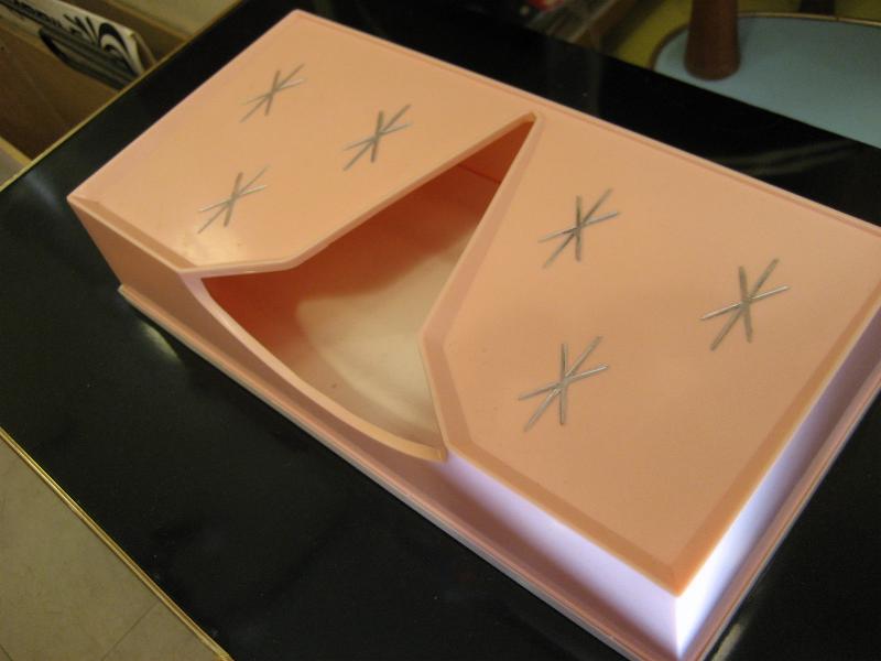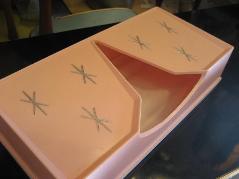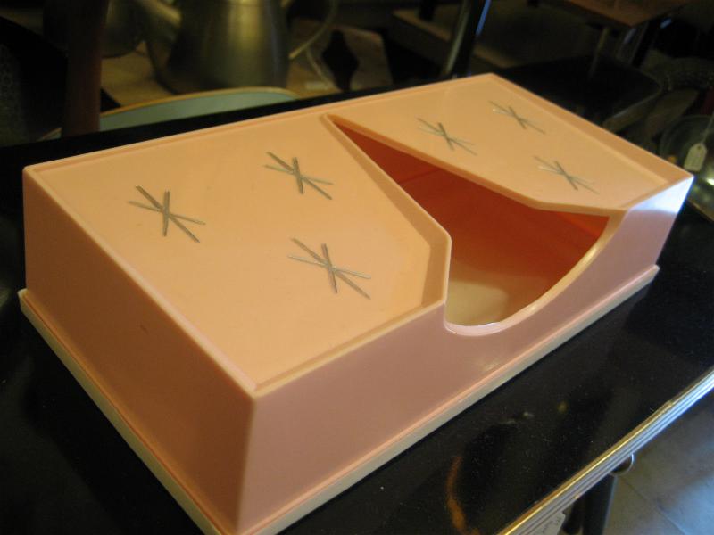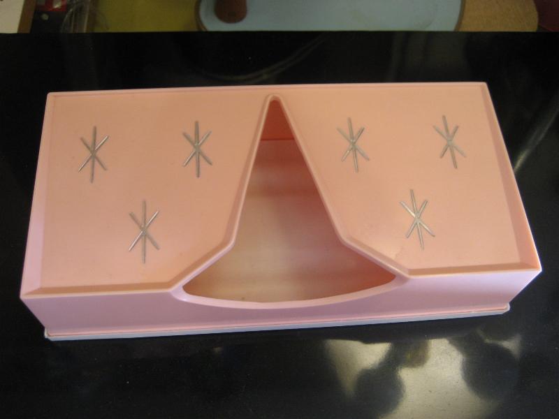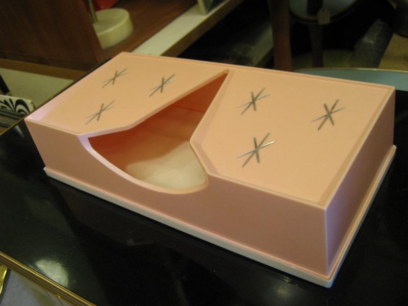 USA. 取り出し口がアトミックシェイプで独特なデザインのビンテージティッシュケース。スターバースト絵柄アクセントがクールでGOODなビンテージバニティピース! 底面はラバーメイドのカバーになっています。 |