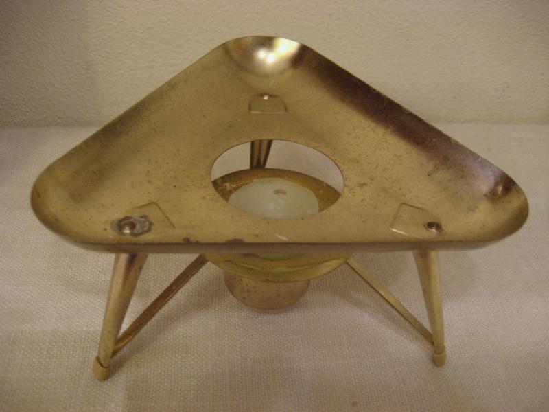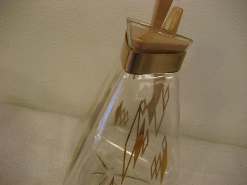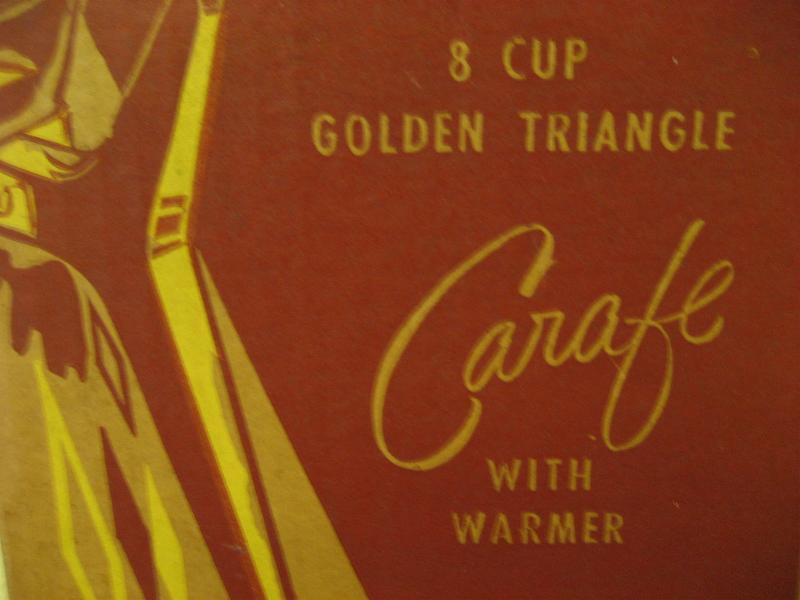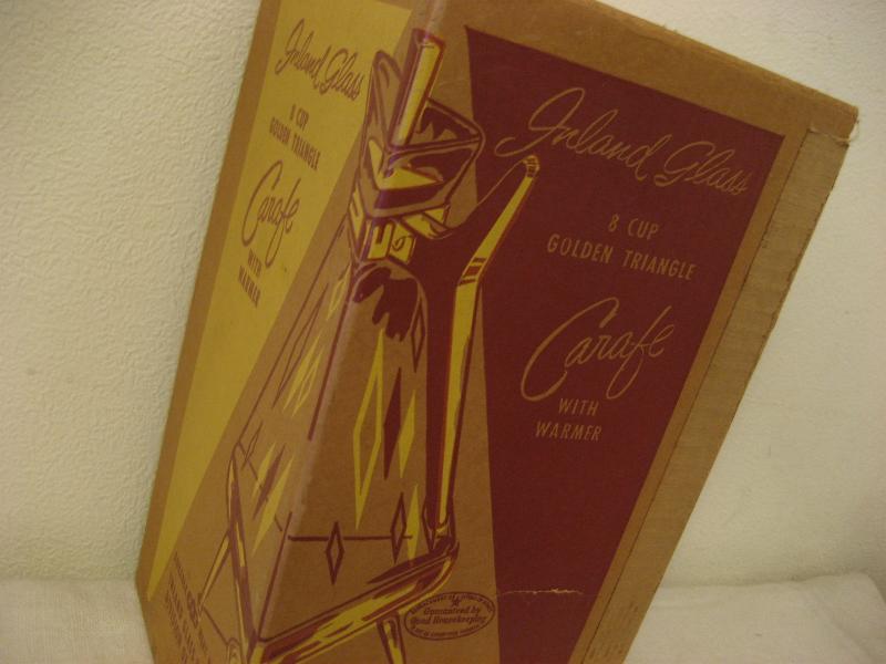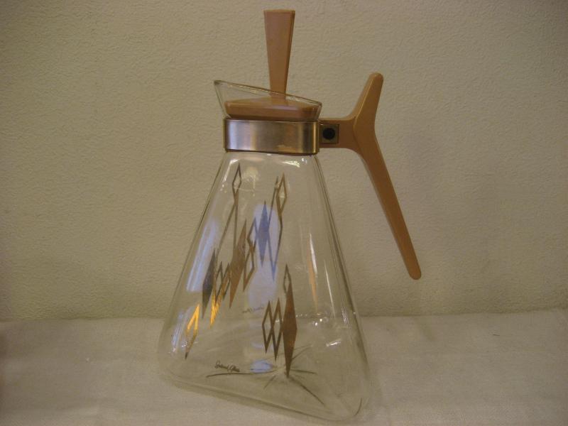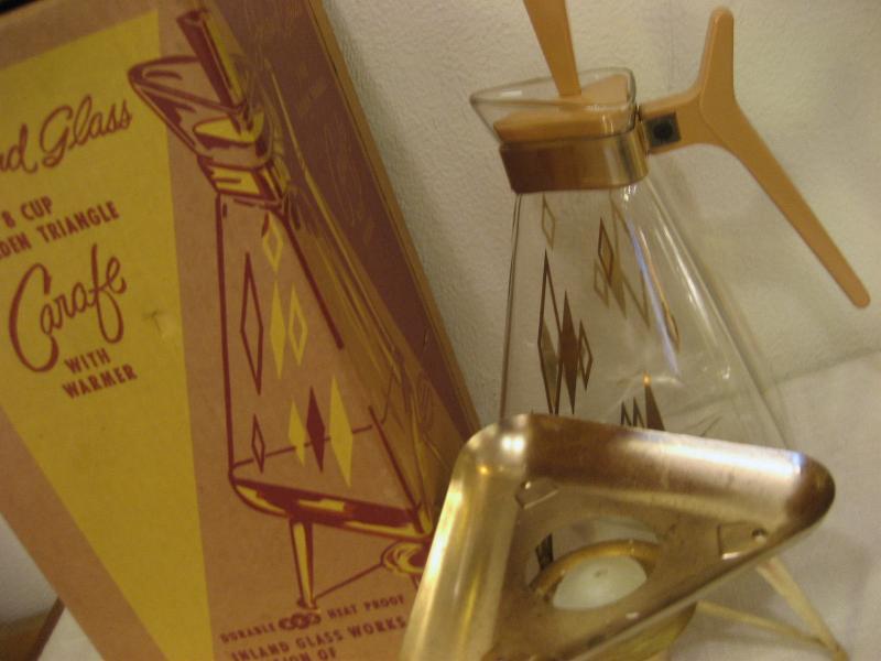 USED COOLなゴールドダイヤプリントのビンテージガラスポット。珍しいトライアングルシェイプのアトミックなデザイン。キャンドルウォーマースタンド付きで、コーヒーや紅茶などにおススメ。。。クールでGOODなビンテージテーブルピース! |