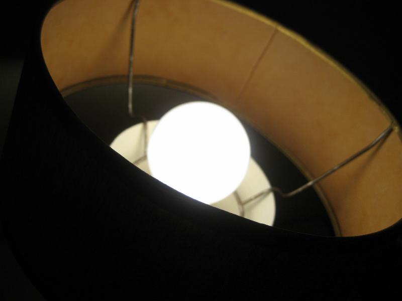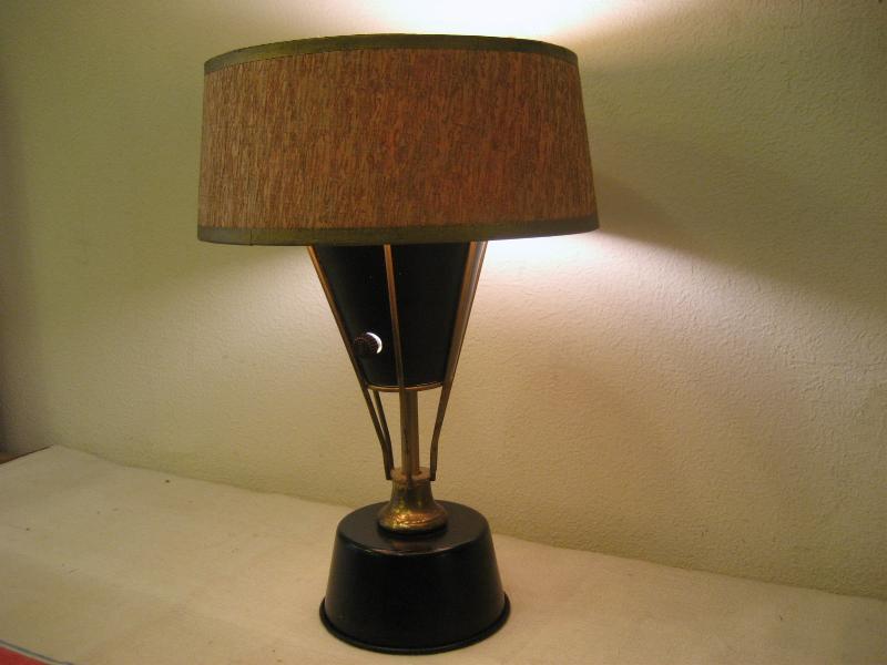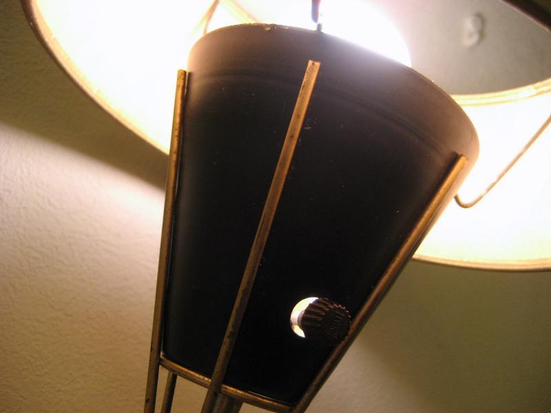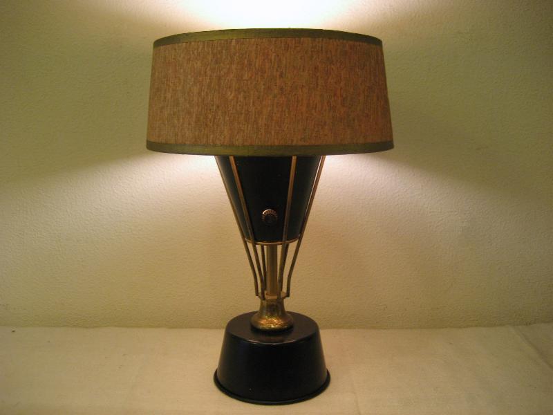 | ビンテージミッドセンチュリーシェードランプ / 50-60年代 USA. ブラックメタルにゴールドワイヤーベースのビンテージテーブルシェードランプ。トップシェードはペーパーメイドでメタルシェード部分のトップにONするタイプ。クールでGOODなビンテージライティングピース! 電源は家庭用コンセント対応コード。スイッチはベース側面に付いていてロータリータイプ。 |