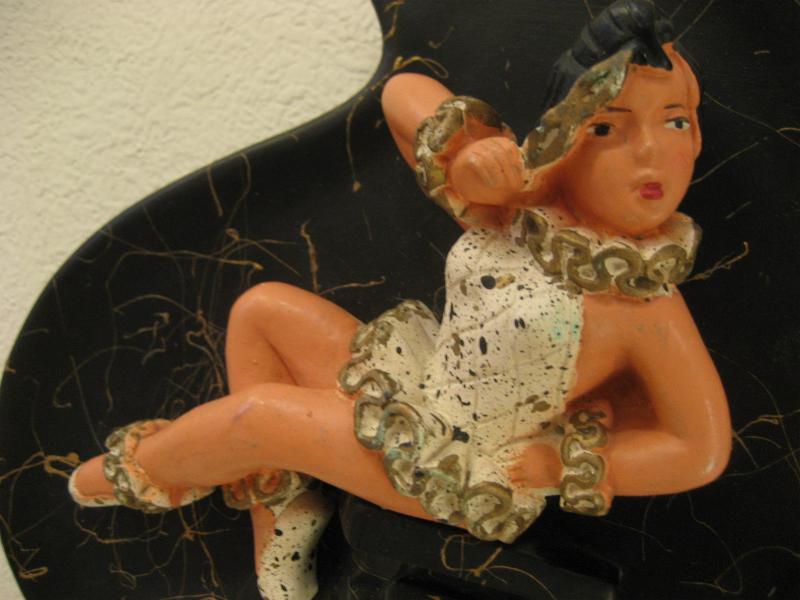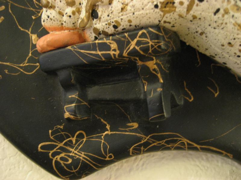 USA. チョークメイドのハーレクイン壁掛けペアです。ブーメランシェイプのブラックベースにゴールドスワール。ダンサーはオフホワイトベースにゴールドとブラックのアクセントコスチューム。それぞれ手にハーレクインマスクを持っています。クールでGOODなビンテージウォールデコピース! |