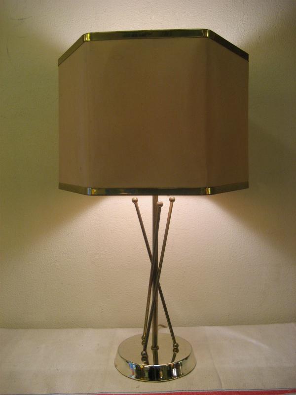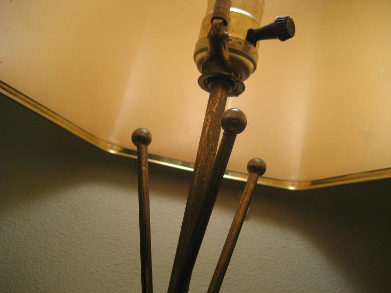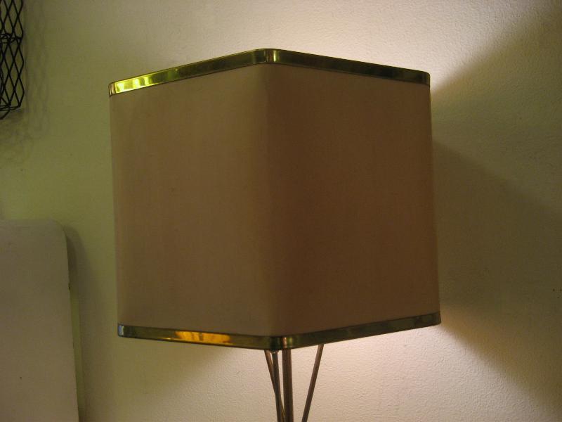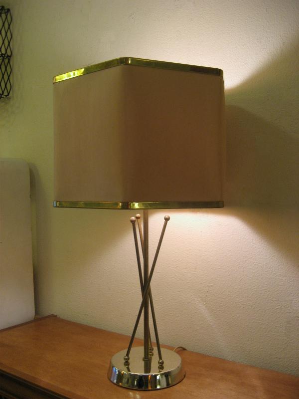 | ビンテージアトミックシェードランプ / 50-60年代 USA. アトミックなブラスワイヤーデコベースのビンテージシェードランプ。シェードは珍しい6辺シェイプタイプでペーパーメイド。クールでGOODなビンテージライティングピース! 電源は家庭用コンセント対応コードでスイッチはランプソケットに付いていてロータリータイプ。 |