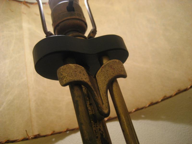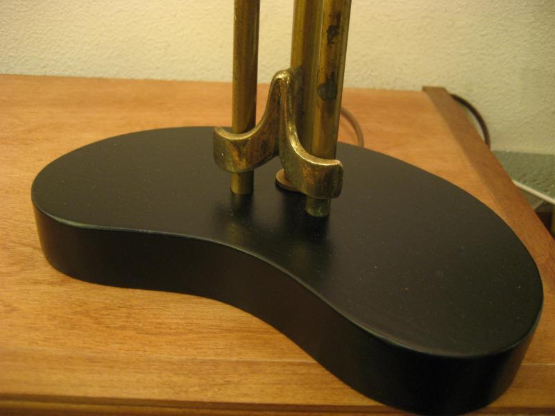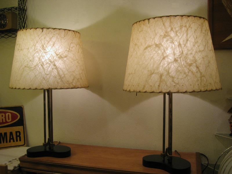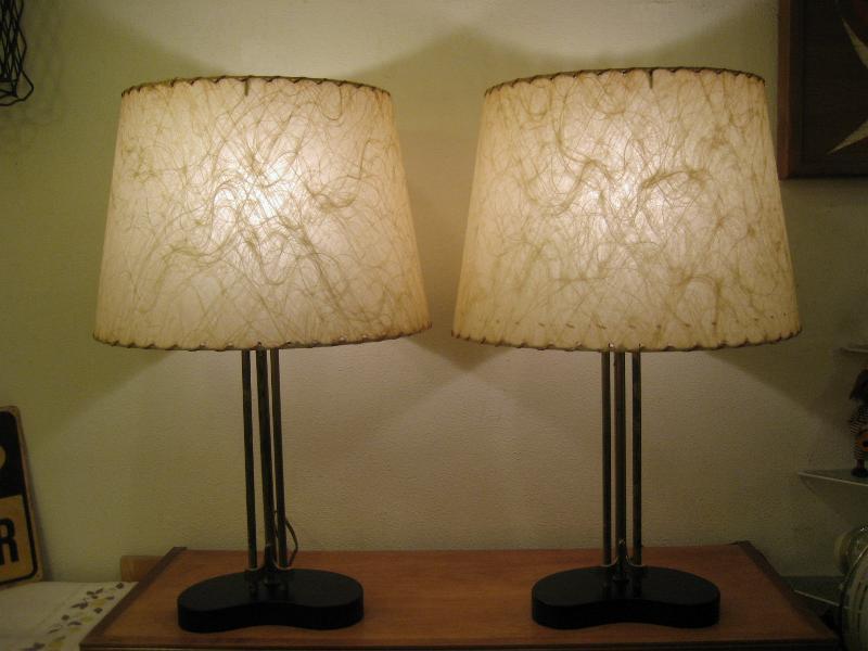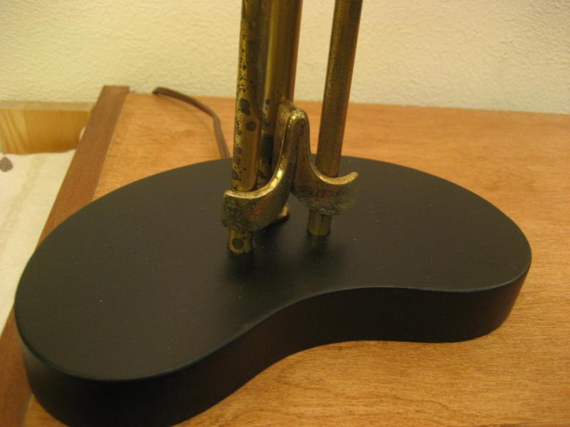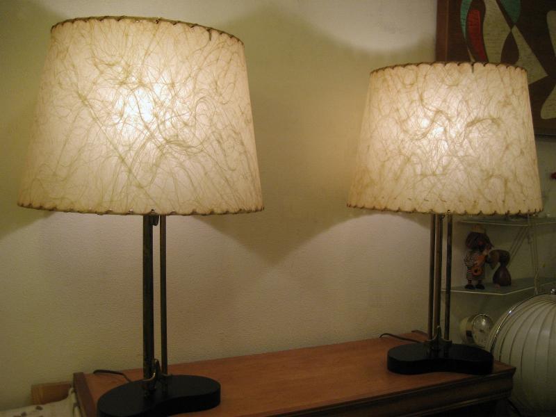 | ペアビンテージシェードランプ / 50年代 USA. ビンテージペアシェードランプ。ブーメランシェイプのブラックペイントウッドベースにゴールドブラススポークとアクセントデコ。シェードはファイバーグラスメイド。クールでGOODなビンテージライティングピース! 電源は家庭用コンセント対応コードで、スイッチはランプソケットに付いていてスライドタイプ。 |